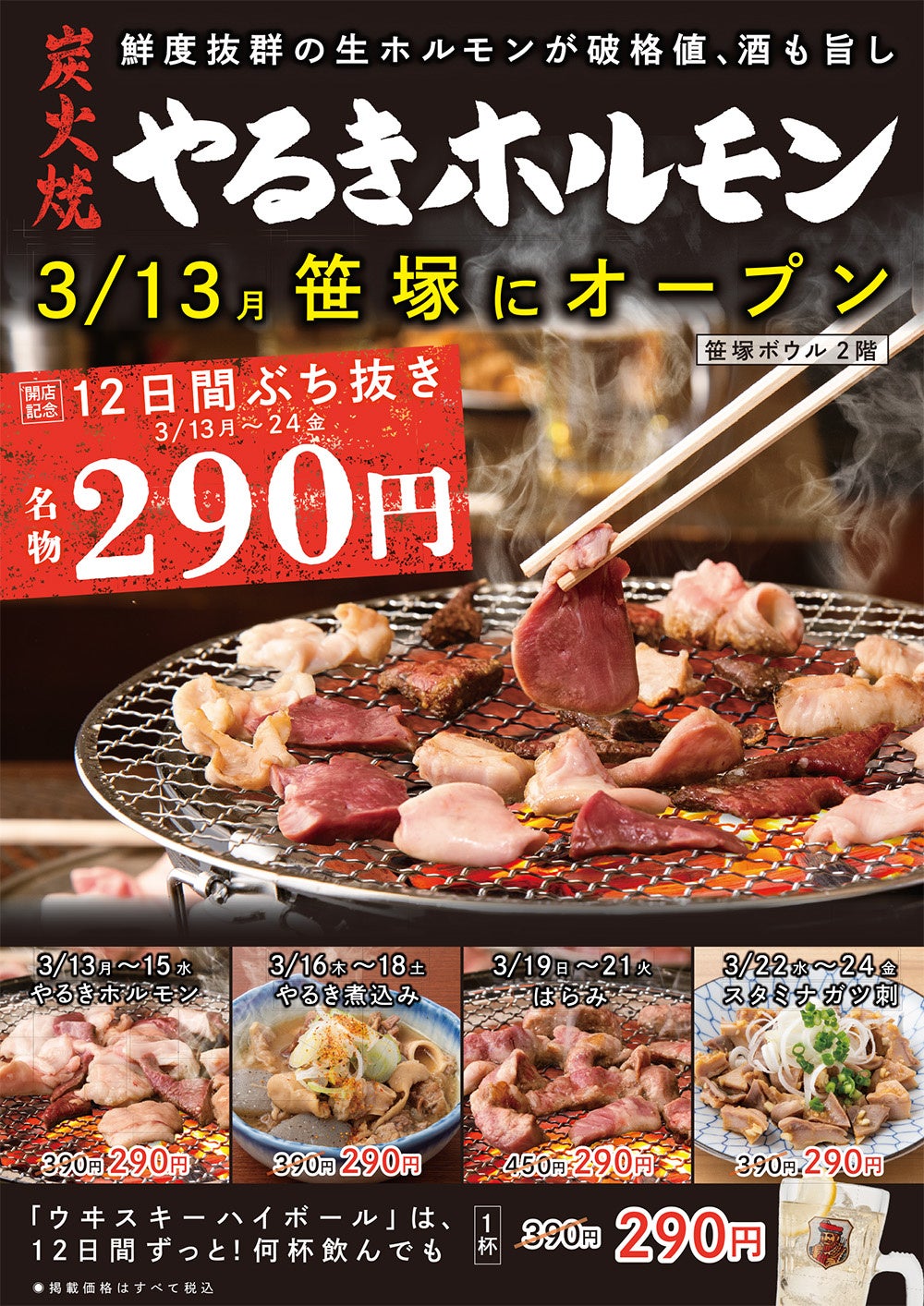なお、オープンを記念して3月13日(月)〜3月24日(金)までの12日間、3日ごとに「やるきホルモン」(通常390円)、「やるき煮込み」(通常390円)といった看板メニュー4品が290円になるキャンペーンを実施します。さらに、キャンペーン期間中はずっと「ウイスキーハイボール」(通常390円)を290円で提供します(詳細は後述)。この期間に、とにかく旨い!ホルモン焼きを思いっきり楽しんでみてはいかがでしょうか。