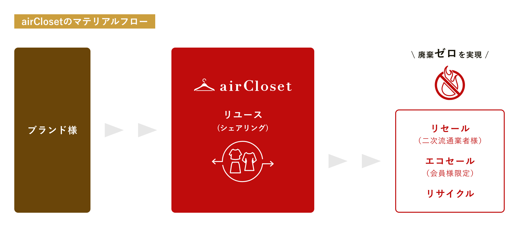 株式会社エアークローゼット(本社:東京都港区、代表取締役社長 兼 CEO:天沼 聰)は、自社で取り扱う全てのお洋服を焼却・埋め立て処分せずにリユース・リセール・リサイクルする“サーキュラーファッション”の基盤を構築し、衣服廃棄ゼロを実現しました。今後はシェアリングモデルである月額制ファッションレンタルサービス『airCloset(エアークローゼット)』を軸にお洋服を最大活用するプラットフォームとして、お客様が自然とサスティナブル消費をしていただけるような取り組みを増やしていきたいと考えています。