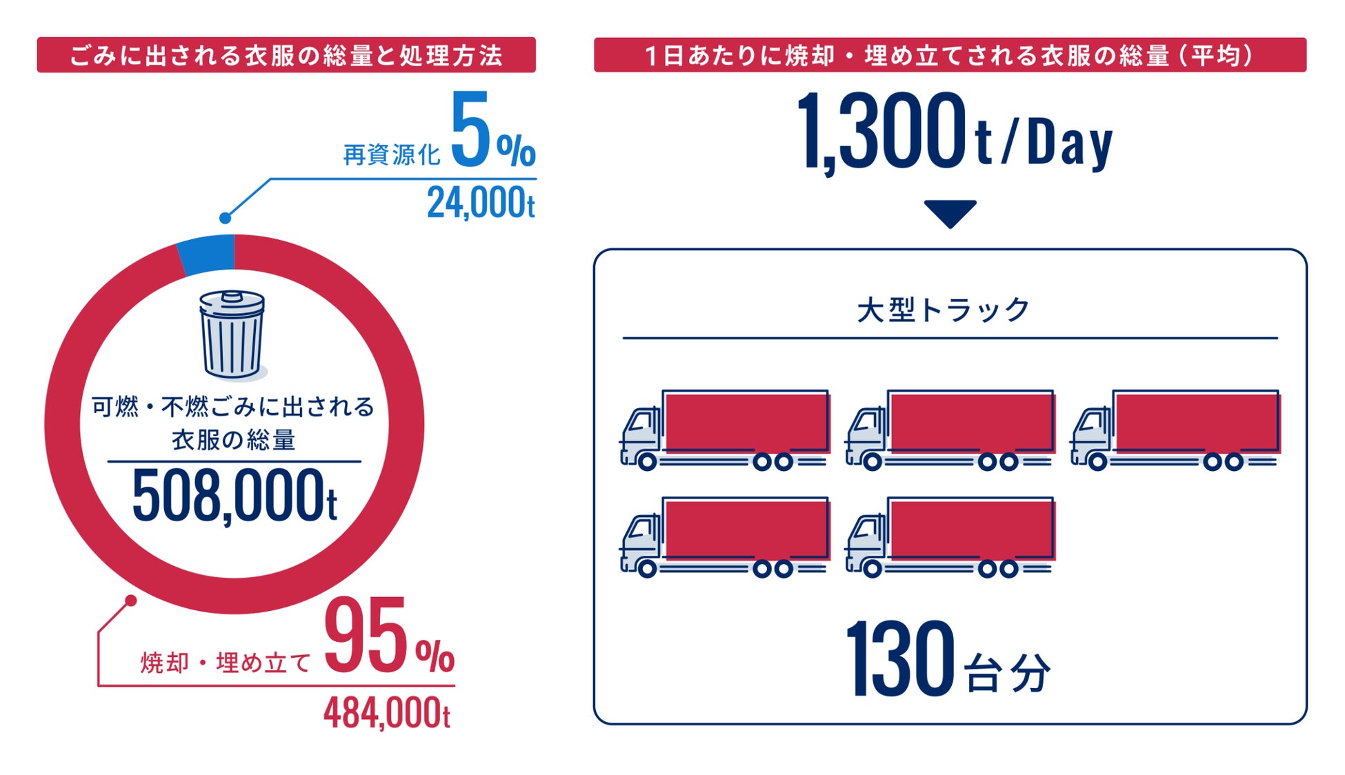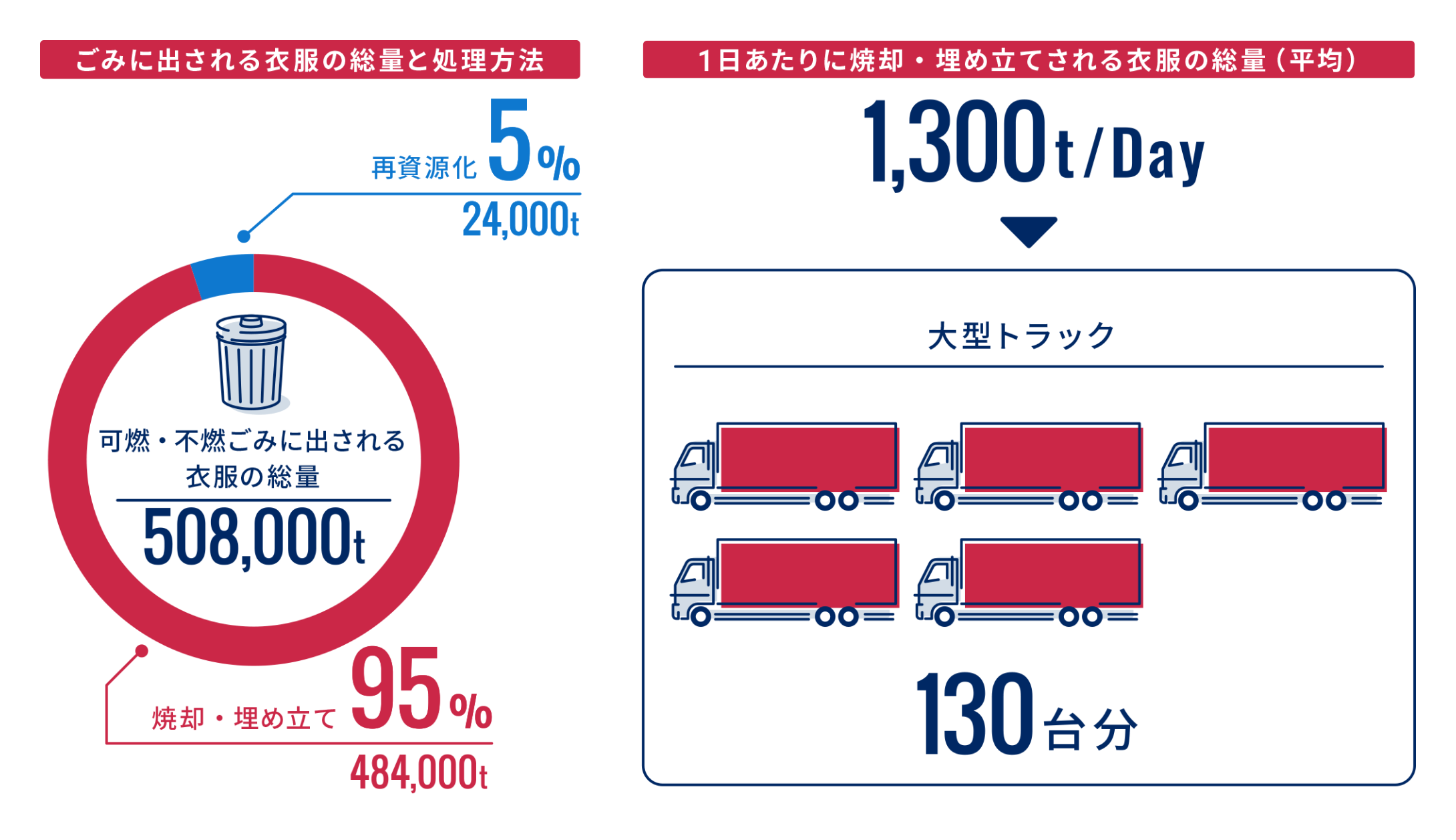 環境省の調査によると、お洋服がごみとして廃棄された場合、再資源化される割合は5%程でほとんどはそのまま焼却・埋め立て処分されます。その量は年間で約48万トン。この数値を換算すると大型トラック約130台分を毎日焼却・埋め立てしていることになります(下図)。*1