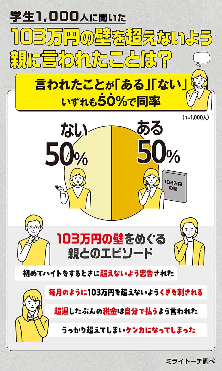 「103万円の壁」を超えて働くことに親から反対された経験があるか聞いたところ、「ある」「ない」いずれも50%でした。学生を抱える親からしてみれば学費や仕送りなど支出がかさむうえ、特定扶養控除がなくなり所得税が増えることは避けたいと思うのも当然でしょう。