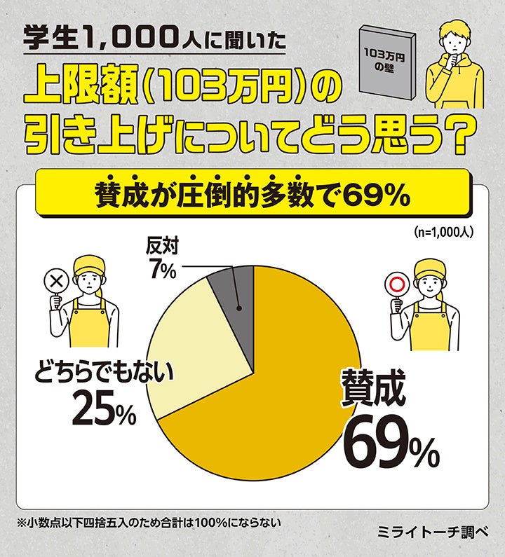 引き上げに対する学生たちの反応は「賛成」が69%と多数を占め、労働時間を増やしたいという声は73%にものぼります。また、労働時間を増やしたい理由としては「生活を今より豊かにしたい」ことが第1位となりました。「103万円の壁」が撤廃されることで、学業だけでなく暮らしや遊びも今より充実した学生生活を送ってほしいものです。