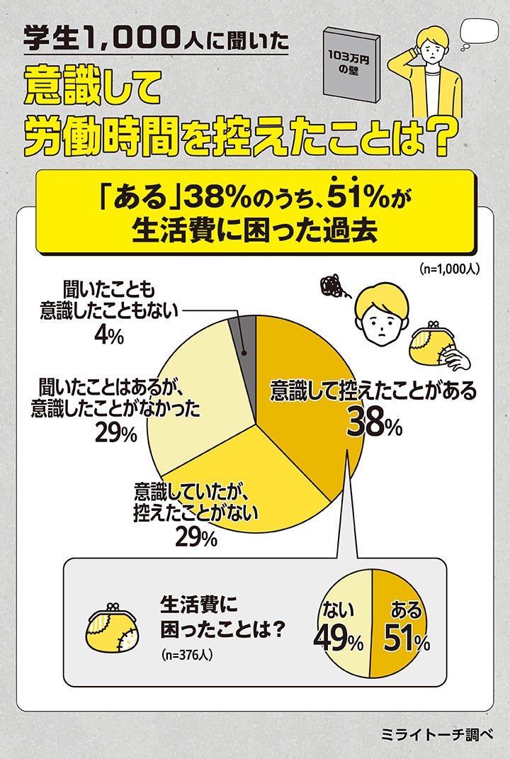 長期にわたって見直しの声が上がっていた「103万円の壁」問題。学生たちにも少なからず影響があったようで、38%が「103万円の壁」を意識して「労働時間を控えていた」ということがわかりました。さらにそのうちの約半数が生活費に困っていたという事実も浮かび上がっています。