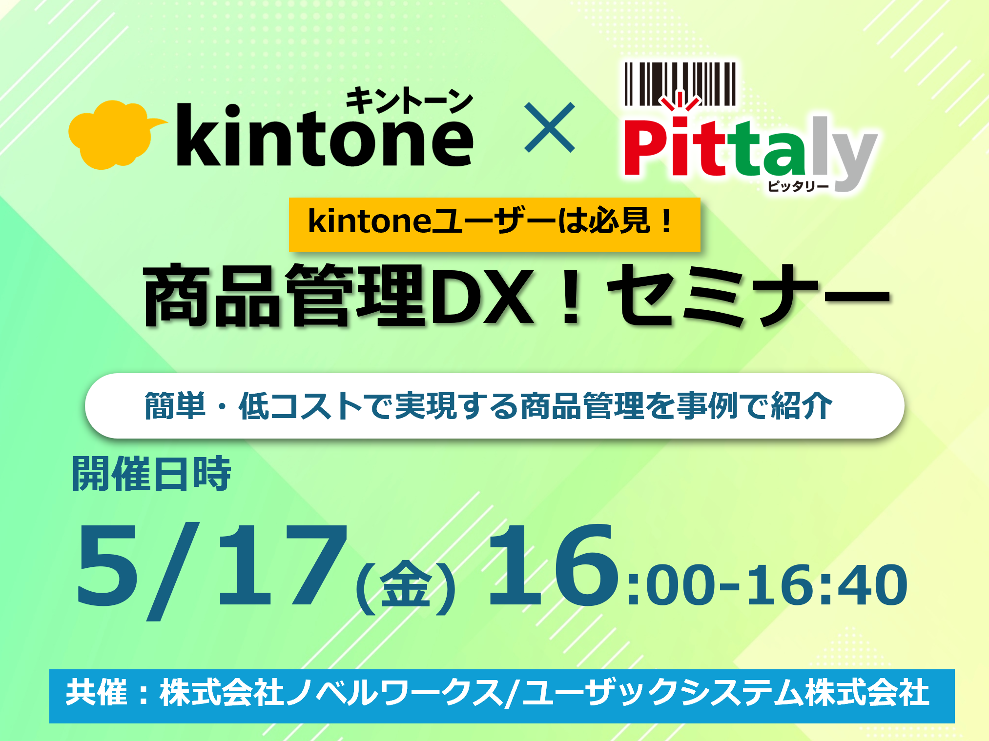 本セミナーでは、多くの企業に採用されてる業務アプリkintoneと、商品バーコードがあればスマホで簡単に商品管理や棚卸ができるPittalyを組み合わせ、サブ業務の非効率をどのように解決できるかを紹介します。