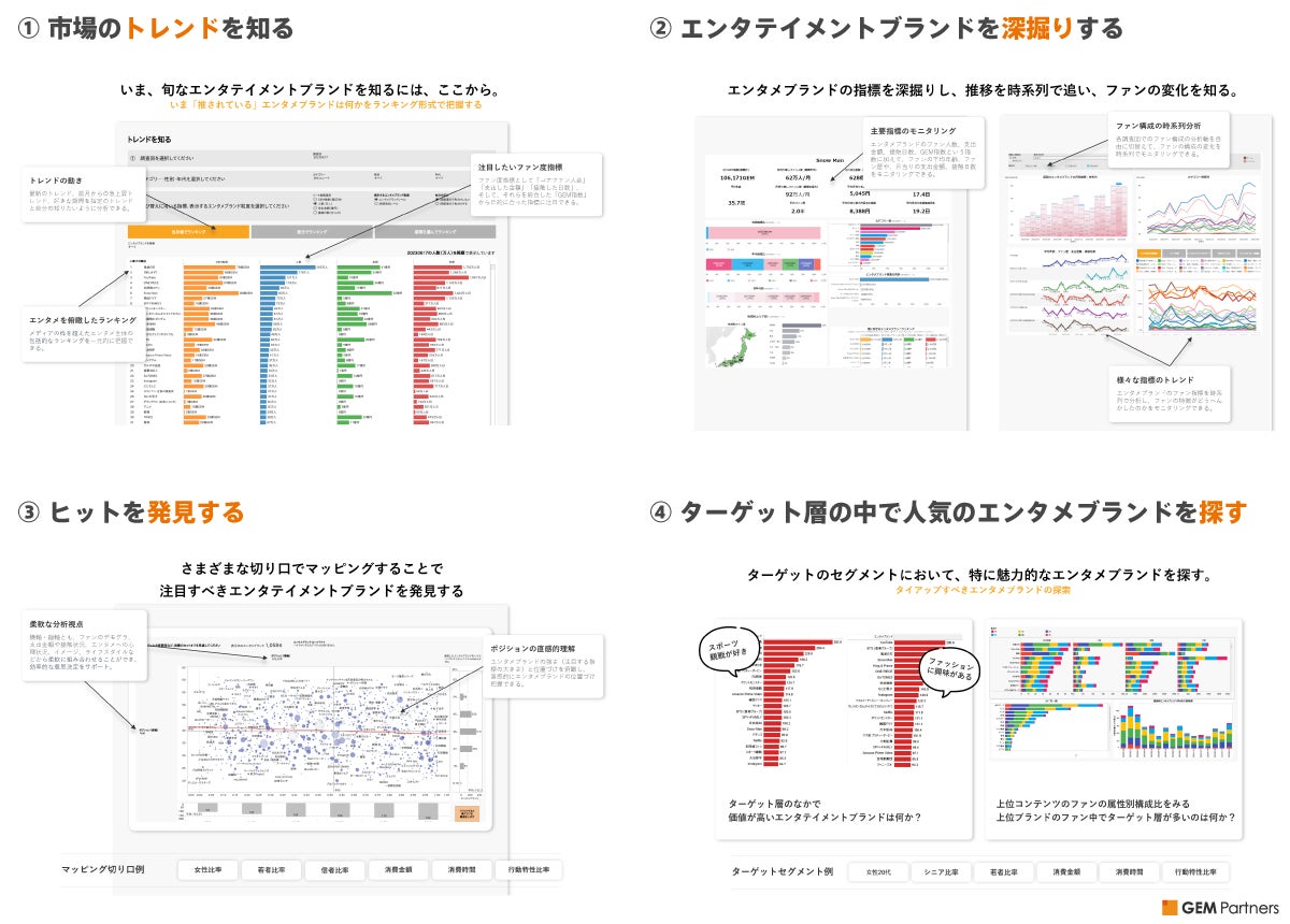 「推しエンタメブランドスコープ」には、用途別に以下の4つの機能を搭載。エンタメブランドやその推しファンを多角的に深掘りし、マーケティング施策の検討、モニタリングに活用できます。
