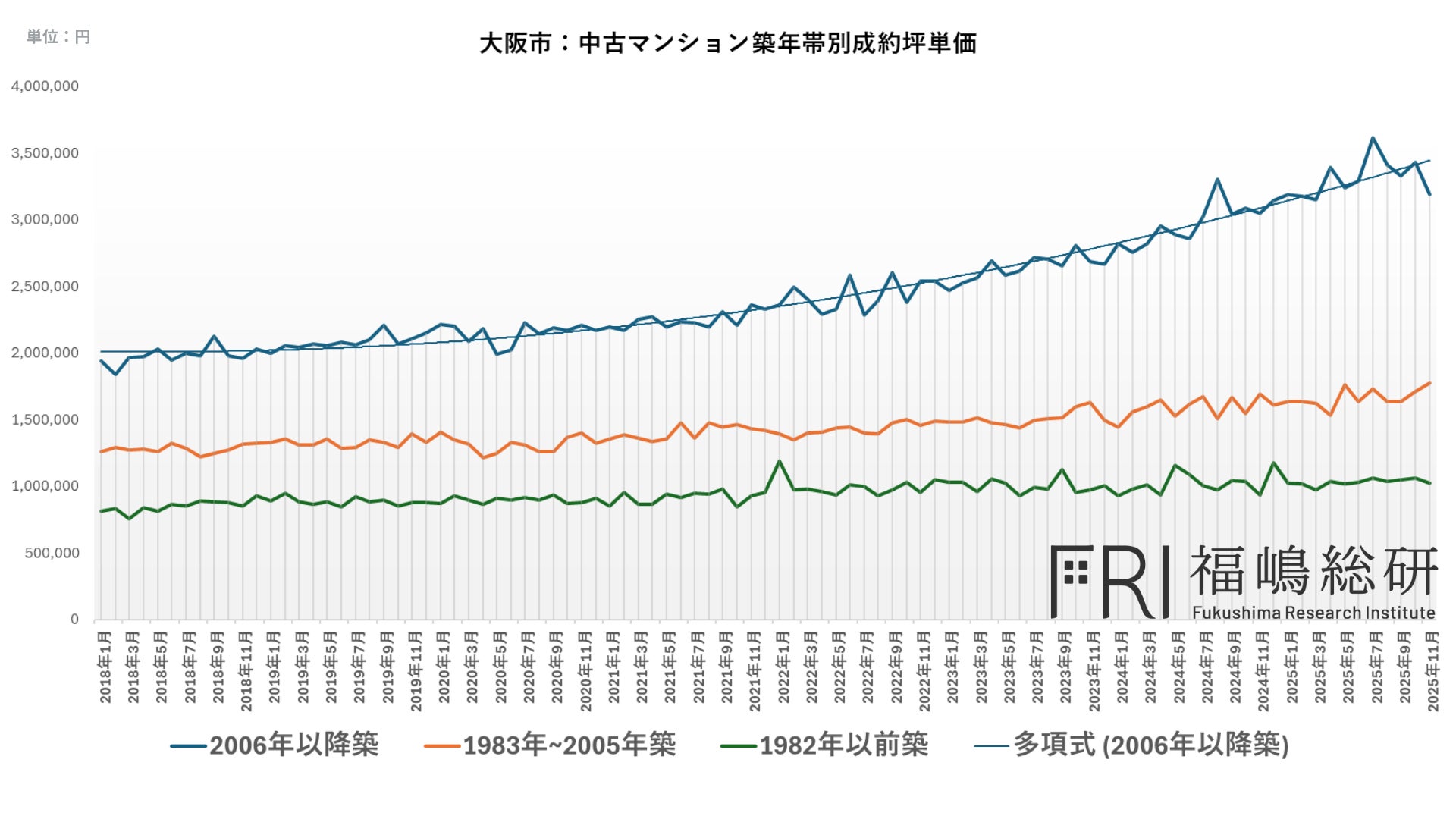 また2005年以前の築年帯も緩やかではありますが価格が堅調に上昇しており、大阪市全体に強い需要が広がっていることがうかがえます。