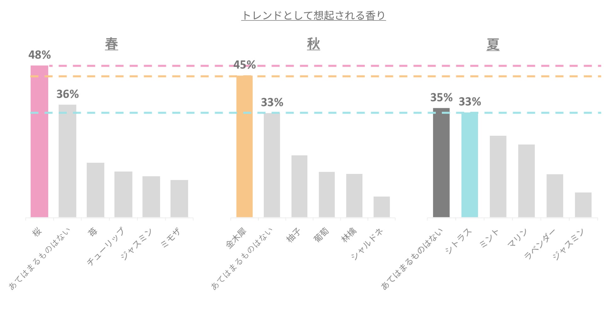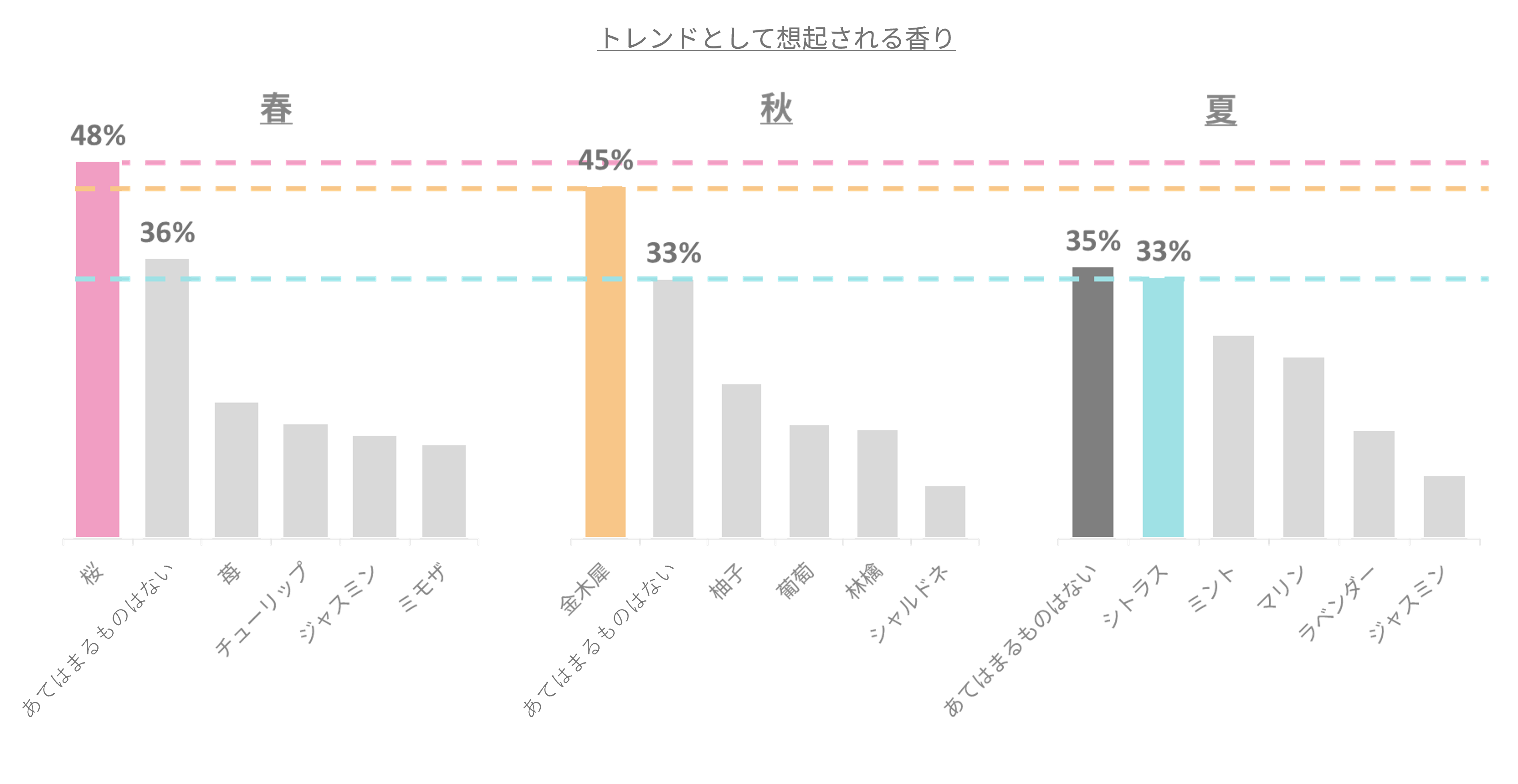 当社が実施した「トレンドとして想起される香り」に関する調査において、春・秋と夏の間には明確な傾向の違いがあることが判明しました。春は「桜」、秋は「金木犀」がそれぞれ圧倒的な票を集め、その香りが季節の象徴として確立されています。一方で、夏に関しては「あてはまるものはない」が最多回答となり、絶対的なトレンドが存在しない「空白地帯」となっていることが浮き彫りになりました。