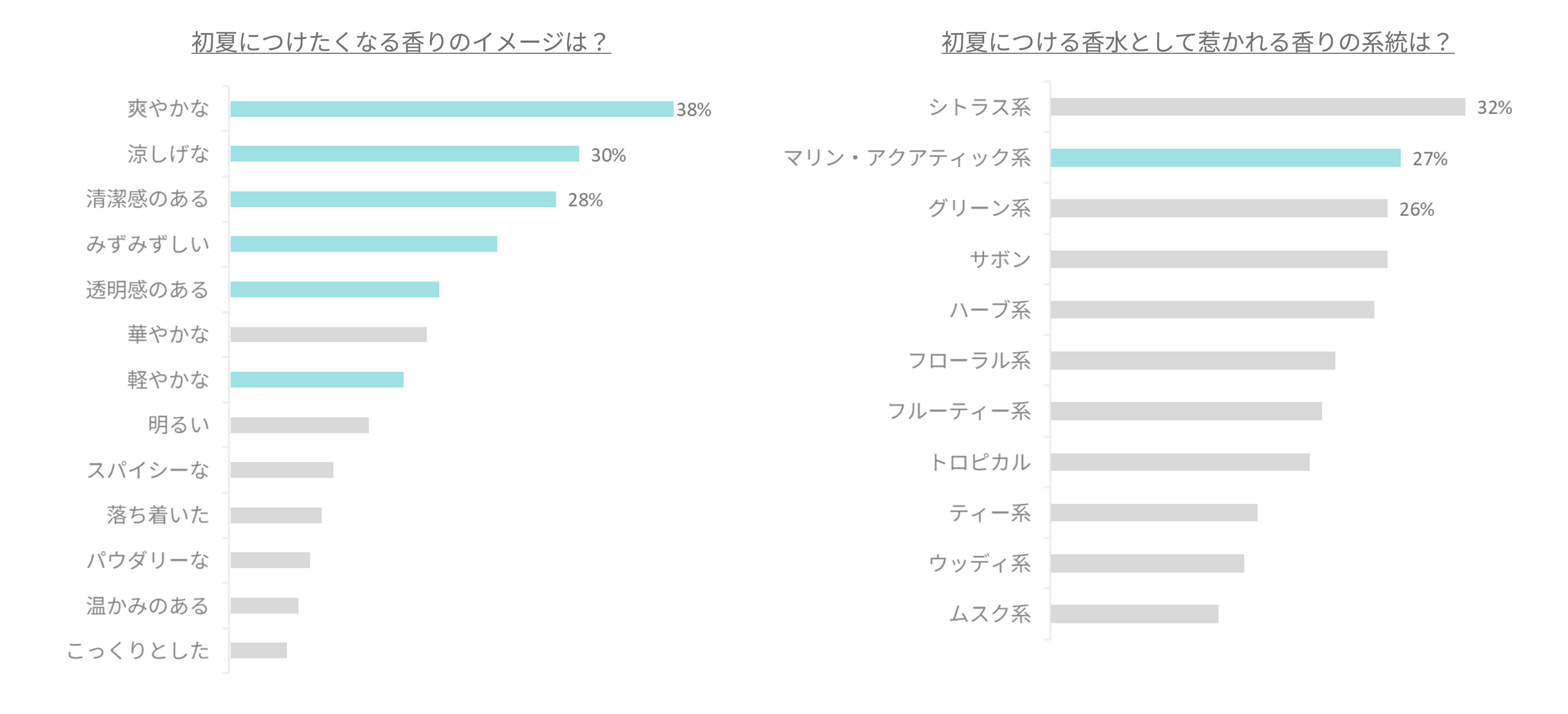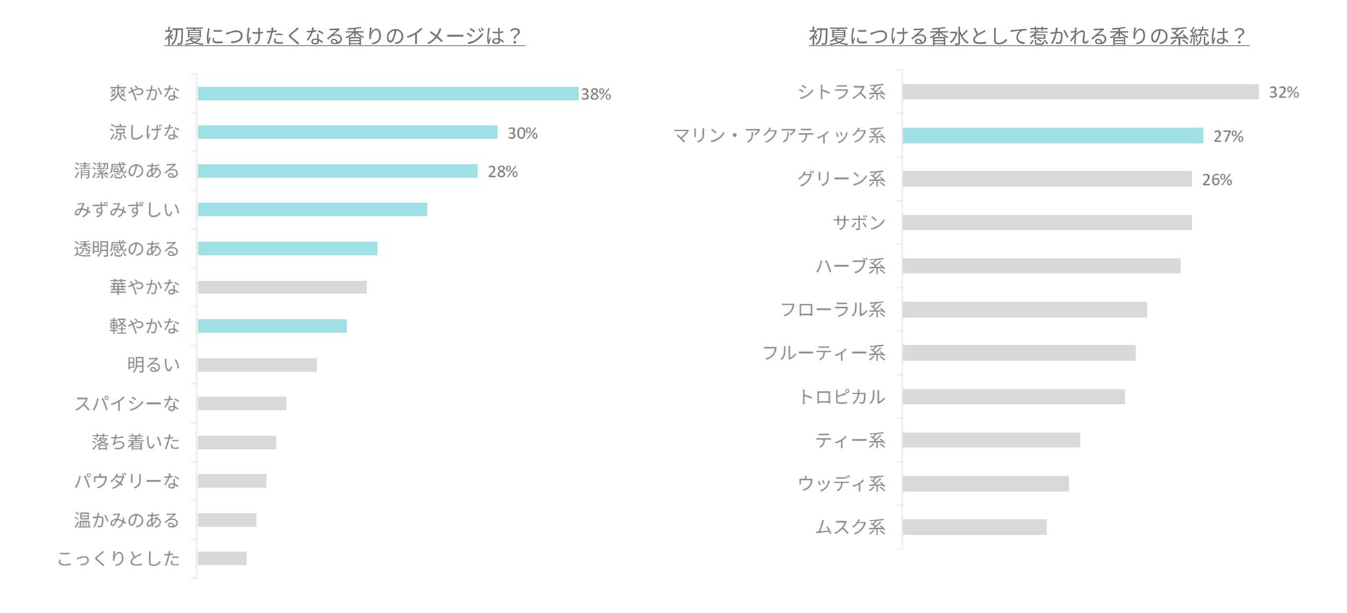初夏に身につけたい香りのイメージとして、上位に挙がったキーワードは「爽やかな」「涼しげな」「清潔感のある」の3つ。この結果から、日本の蒸し暑い夏において、香りには圧倒的な「清涼感」が求められていることが再確認されました。さらに、具体的に惹かれる香りの系統として、機能的なイメージの強い「シトラス系」に次いで、「マリン・アクアティック系」が高い支持を集めています。