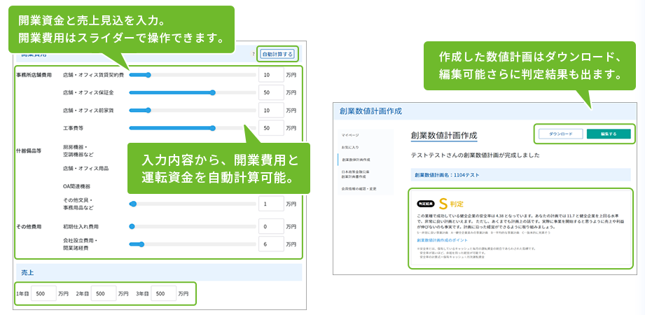 創業費用や売り上げ見込みを入力することで、創業後の利益や資金繰りを自動計算で数値化し、起業・開業アイディアを具体的な数値計画にします。