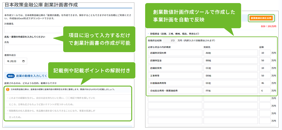 日本政策金融公庫の創業融資に必要な「創業計画書」が作成できます。