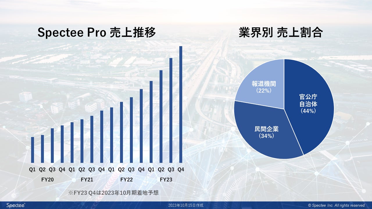 スペクティは創業以来、防災領域において最新の技術を活用したソリューションを展開してまいりました。主力のSaaSプロダクトであるAI危機管理ソリューション『Spectee Pro』は、2023年7月時点で顧客数は960を超え、直近3年間で約3倍となり、MRRは前年同月比160%以上で推移しています。