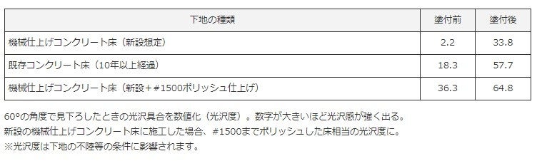 また、機能面においても、化学反応でコンクリート床表面に緻密な層を形成し従来の表面強化材と同様の耐久性を実現。加えて特殊な熱硬化樹脂の効果によって耐薬品性も向上し、コンクリートに染み込みやすいエンジンオイルなども除去しやすい床となり、メンテナンスコストの低減も可能とします。