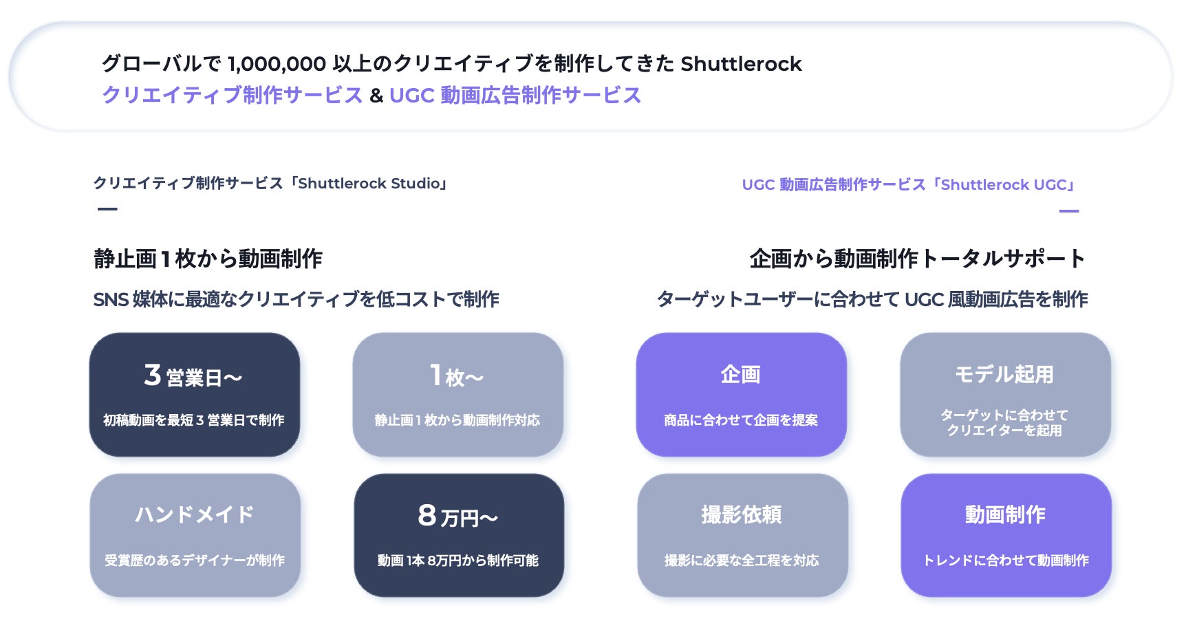 広告やSNS 運用で成果につなげるためのソリューション「Shuttlerock Studio」「Shuttlerock UGC」を提供しており、各SNS のベストプラクティスに基づいた動画制作により、SNS 運用の効果を最大化させます。