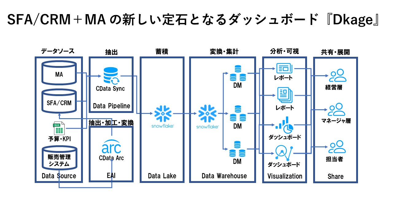 国内で1,700社に対しSalesforce およびAccount Engagement を導入しているtoBeマーケティングがデータパイプラインツールである『CData Sync』および基幹・外部販売管理ツールとSalesforce のBtoB 連携ツール『CData Arc』を駆使することで、データを統合分析環境にシームレスに連携する『Dkage』ソリューションを提供します。データウェアハウス(DWH)であるSnowflake でのデータ加工やデータを可視化するダッシュボードは、両社が知見を持ち寄り厳選した定石シナリオ5種類を準備し、ユーザーのデータをつなげば、すぐに実務でデータ利用が可能になっています。