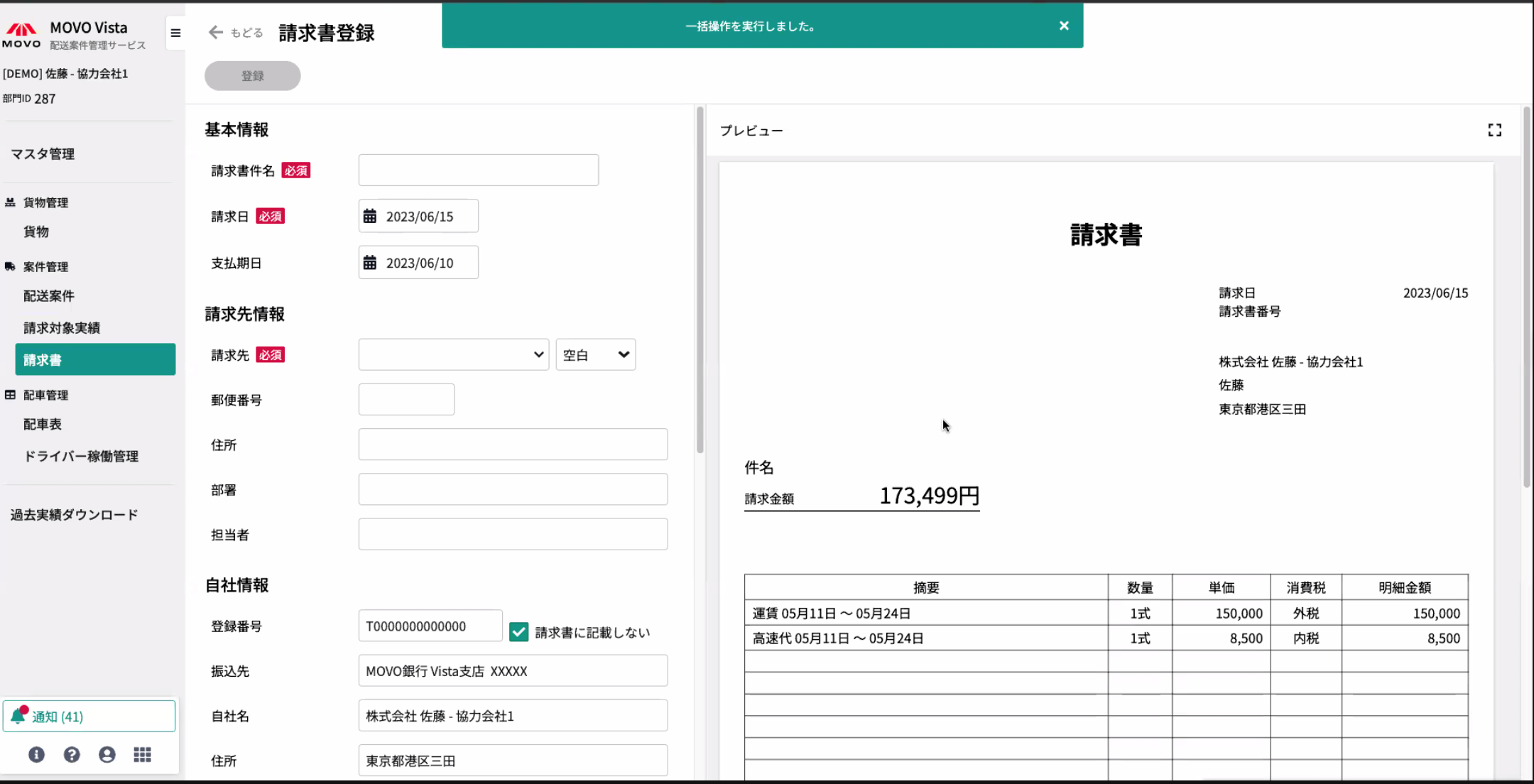 MOVO Vistaでは料金マスタや依頼主ごとの締め処理のルール設定(積日基準、月末締め等)、請求書発行マスタを活用することで、約1分で請求書を発行できます。またインボイス制度に対応した適格請求書の発行が可能です。