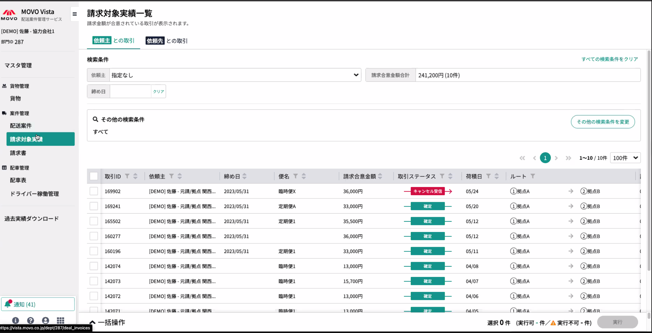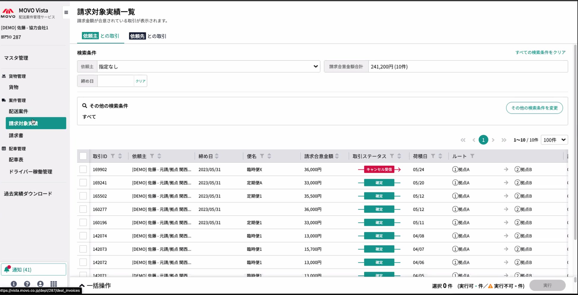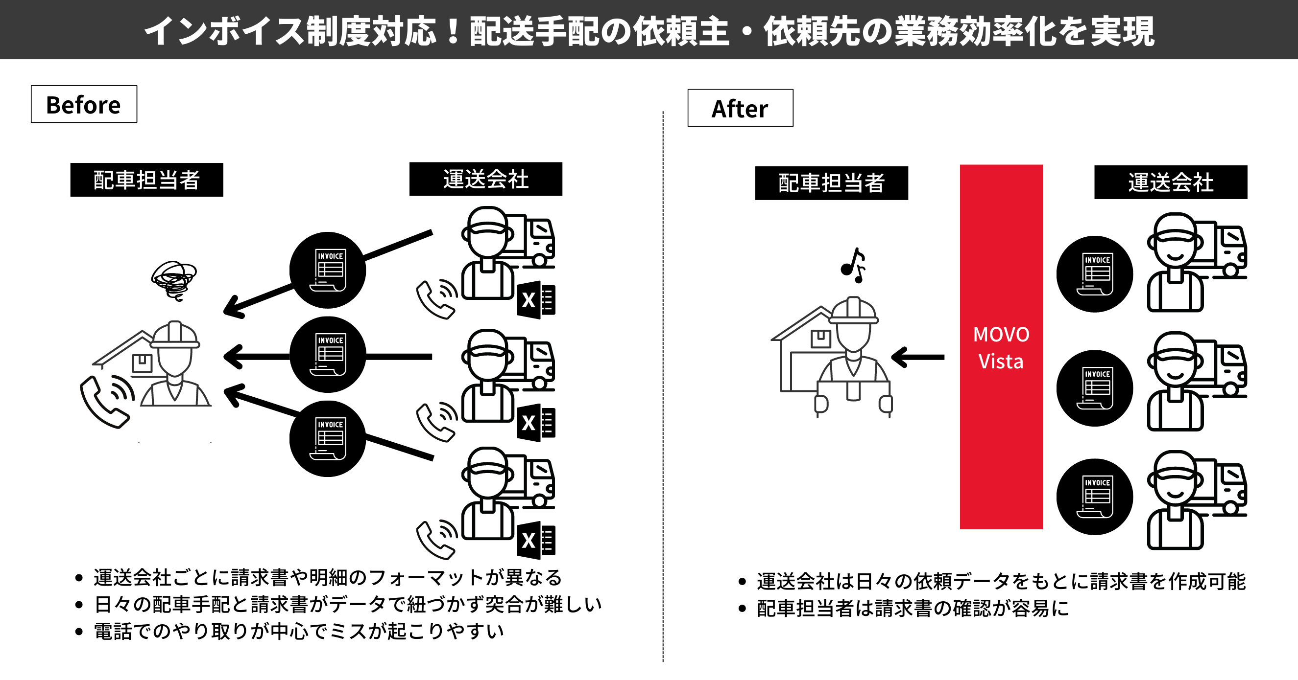 MOVO Vistaで発行した請求書は、MOVO Vista上の日々の配送案件データと紐づいているため依頼主と依頼先間での請求データの突合作業をゼロにすることができます。