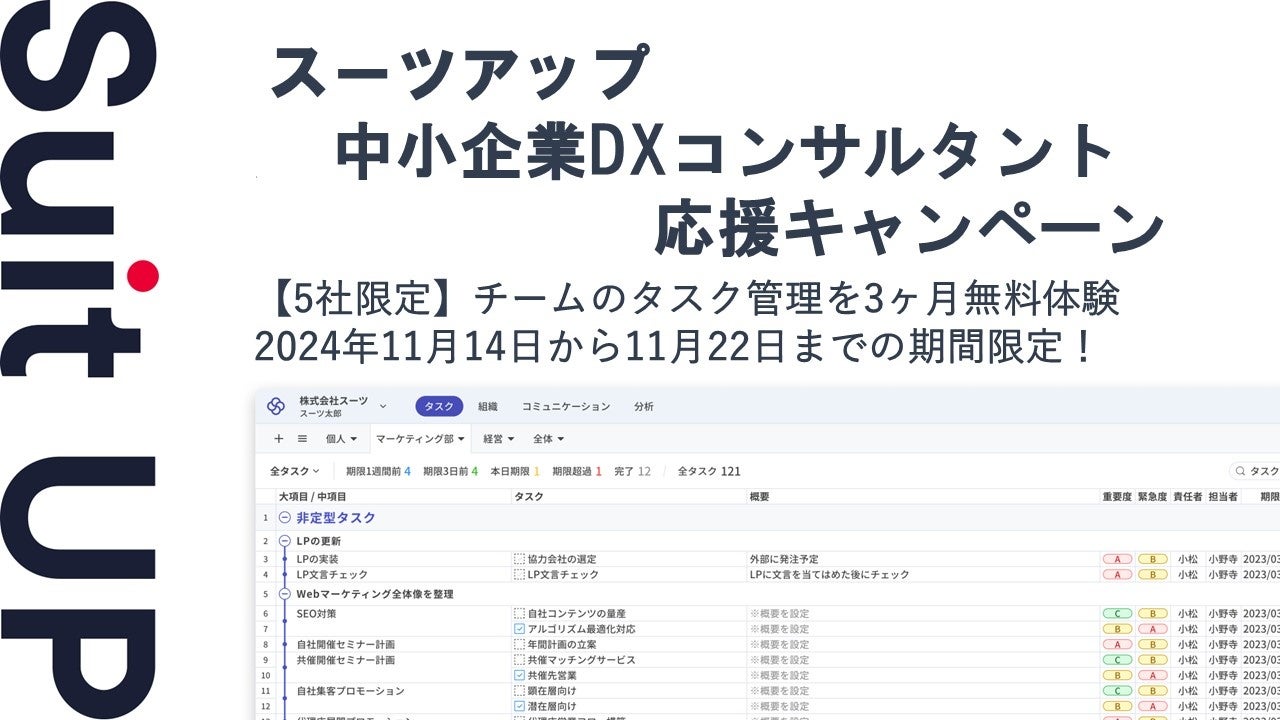 株式会社スーツ(所在地:東京都千代田区、代表取締役社長CEO:小松 裕介)は、チームでかんたん、毎日続けられるプロジェクト・タスク管理ツールの経営支援クラウド「Suit UP」(スーツアップ)において、中小企業DXコンサルタント応援キャンペーンを実施いたします。