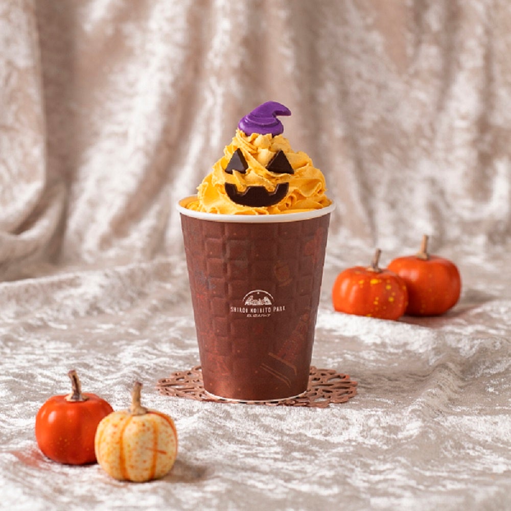 白い恋人パークオリジナルチョコレートドリンクの上に、ジャック・オー・ランタン型のかぼちゃホイップクリームを絞りました。