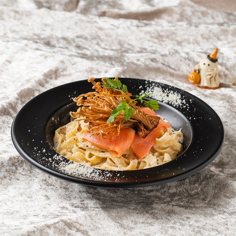 【スモークサーモンとポルチーニクリームのフェットチーネ】1,300円(税込)