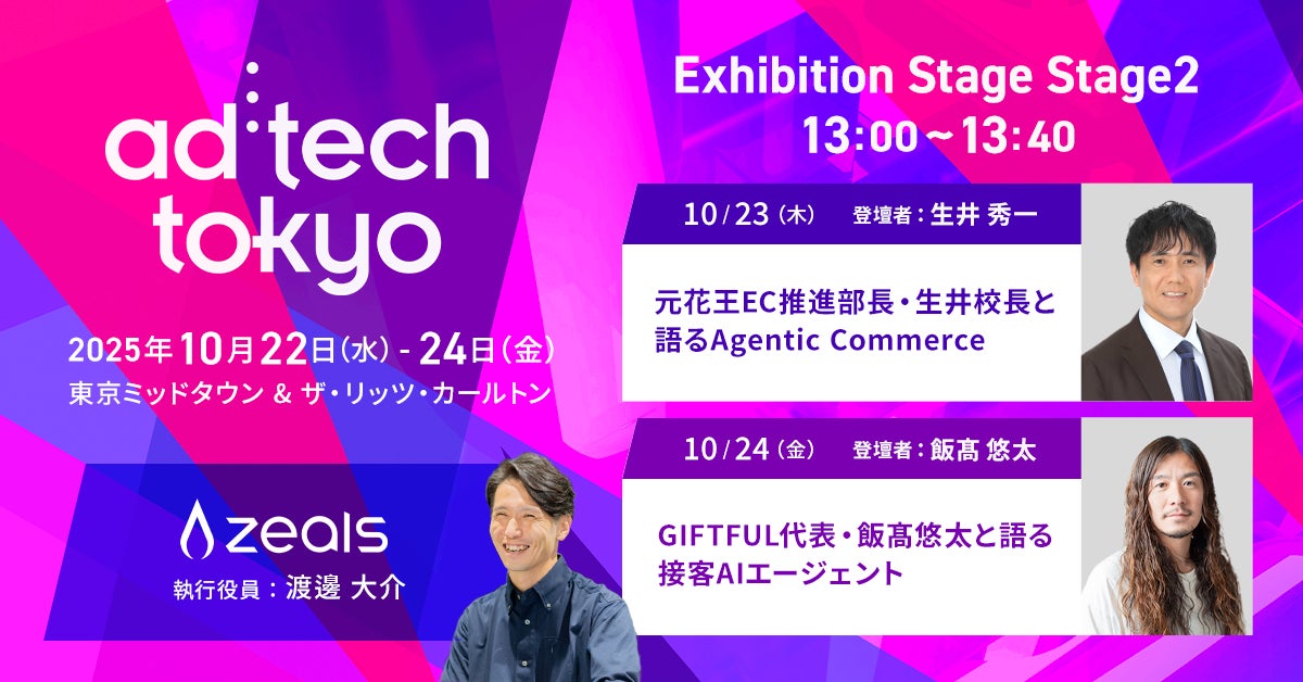 接客AIエージェントを提供する株式会社ZEALS(所在地:東京都目黒区、代表取締役:清水正大、以下「ジールス」)は、2025年10月22日(水)から24日(金)にかけて開催されるアジア最大級のマーケティング・テクノロジーイベント「ad:tech tokyo 2025」において、10月23日、24日の2日間にわたり「AIエージェントによる次世代のEコマース体験」をテーマとしたセッションに登壇することが決定いたしましたことを発表します。