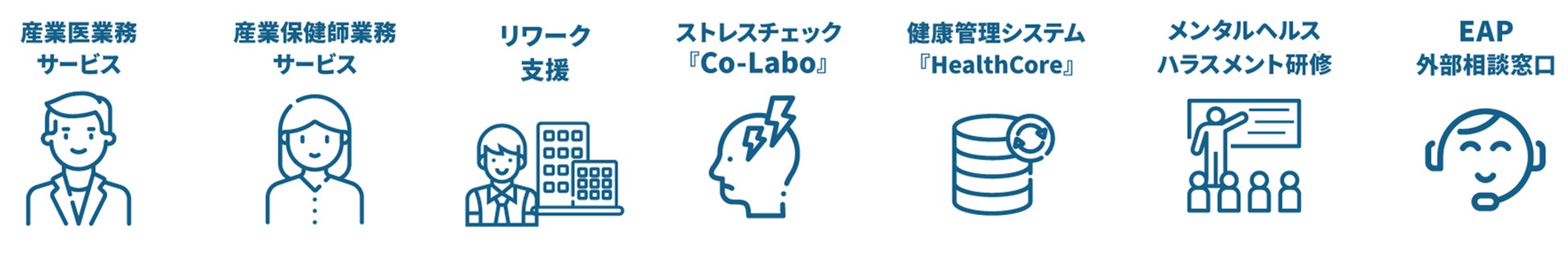 『産業保健トータルサポート』では、医師紹介業20年のノウハウとネットワークによる産業医や保健師の紹介・選任後の業務サポートをはじめ、リワーク支援サービスや、ストレスチェック『Co-Labo』、メンタルヘルス・ハラスメント研修、専門家相談サービス等で、企業の健康経営を総合的に支援しています。