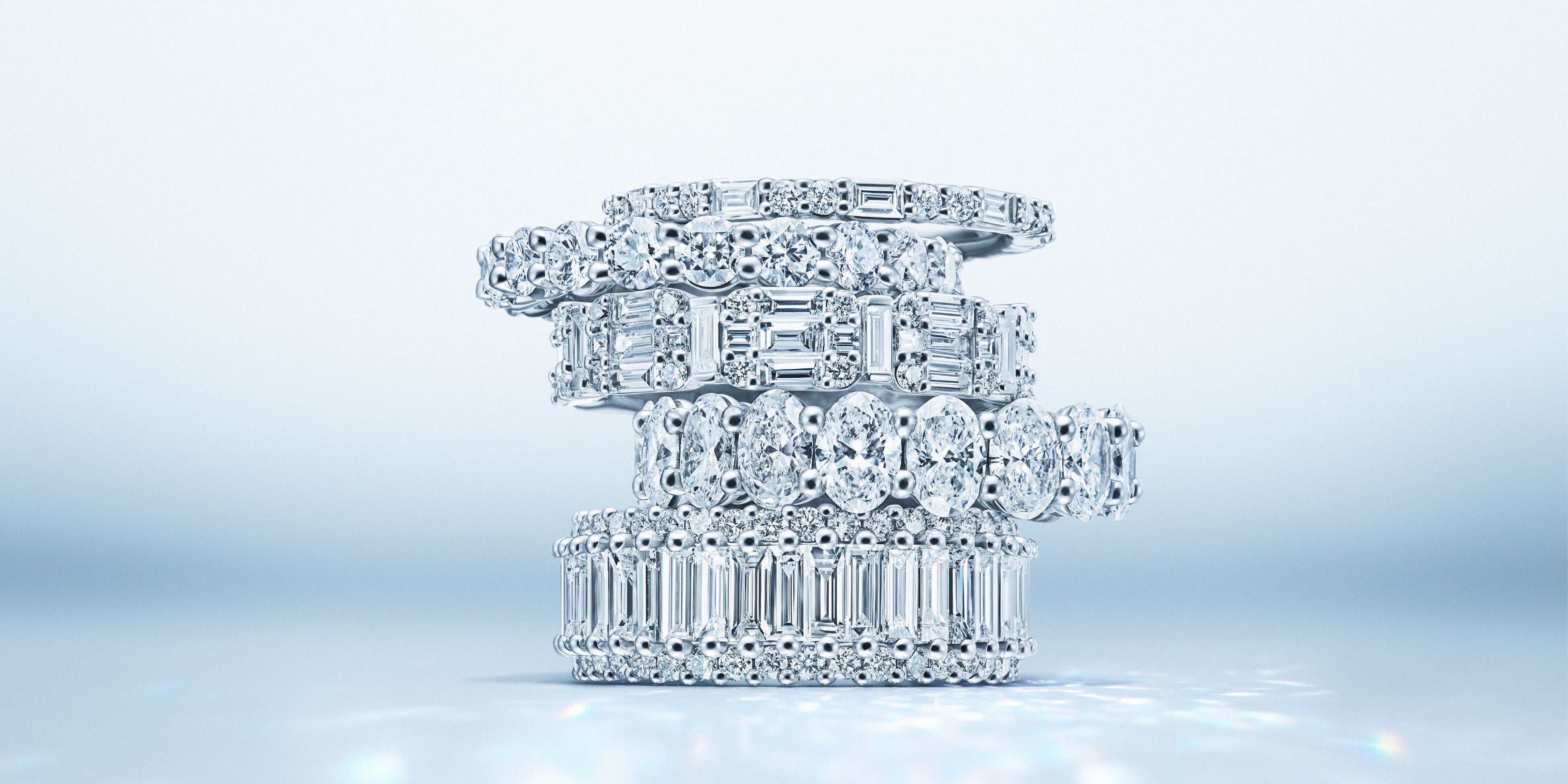 ラウンドブリリアントカットやエメラルドカット、オーバルカットなどの大粒ダイヤモンドを並べてセッティングした、眩い輝きを放つ1点でも存在感抜群のエタニティリングを取り揃えております。