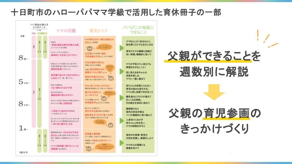 十日町市のハローパパママ学級(両親学級)において、沐浴や抱っこ体験などの育児体験に、家事・育児分担のコツや父親ができる育児をまとめた育休冊子を加えることで、父親の育児参画のきっかけづくりをすることとなりました。