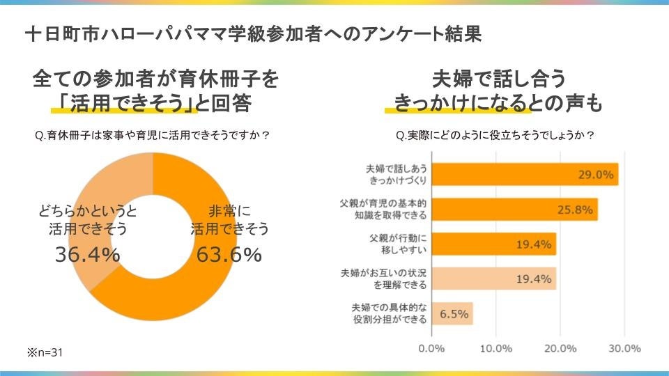 これまでに開催した2回のハローパパママ学級の参加者(合計11名)に家事・育児に育休冊子が活用できそうかアンケートを取ったところ、全ての参加者から活用できそうとの回答をいただきました。具体的には、父親の育児参画のきっかけづくりはもちろんのこと、夫婦で話し合うきっかけづくりに役立ちそうとの声も多数いただきました。