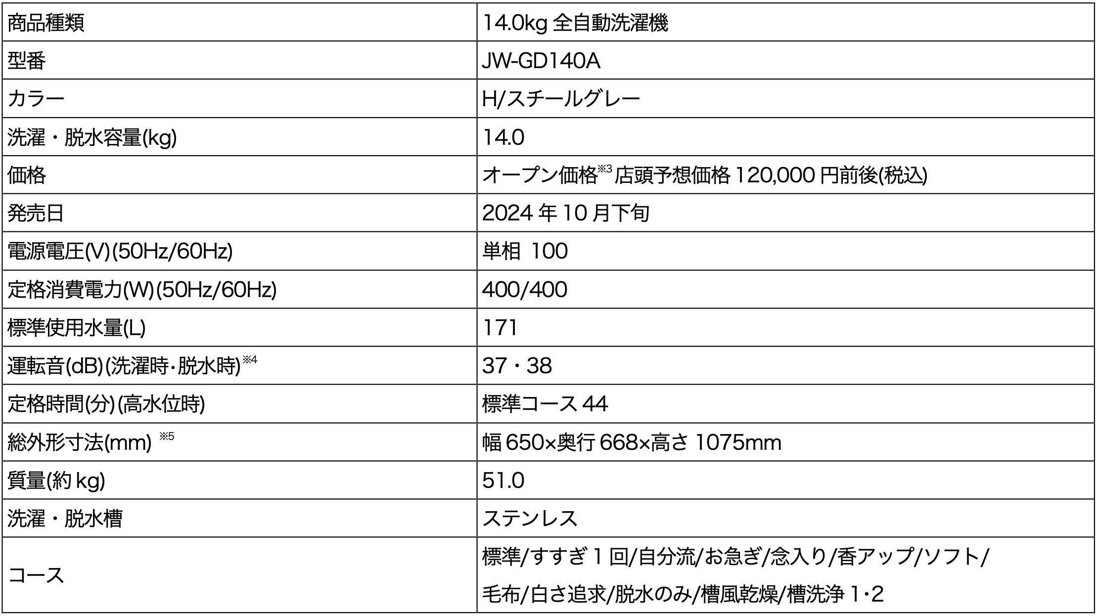 14.0kg 全自動洗濯機(JW-GD140A)の概要は以下の通りです。