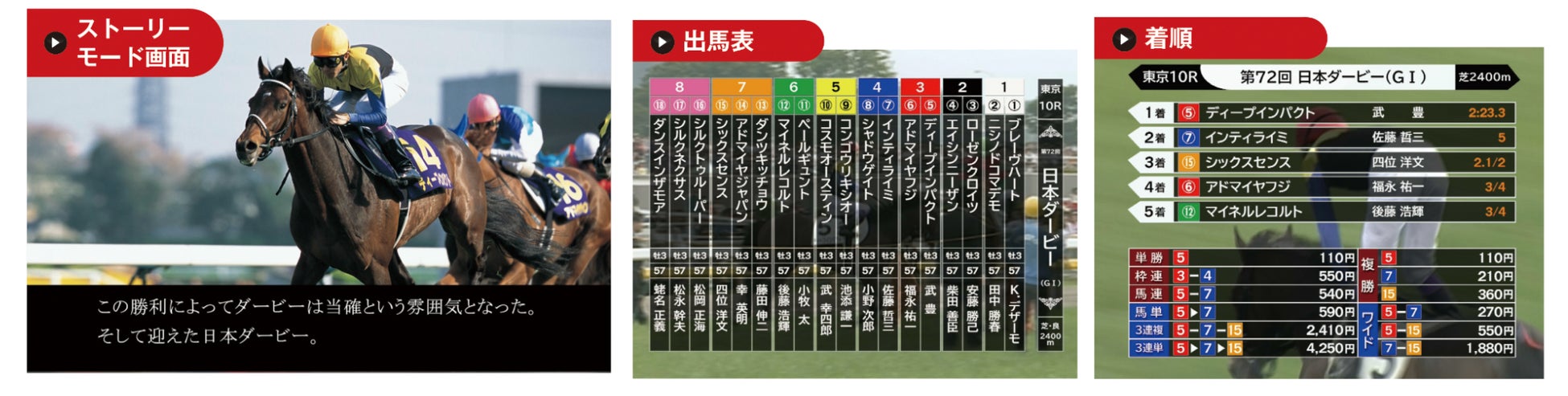 レース映像にはオリジナル要素として、出走表やゴール後の全着順・レースデータなどレース内容がより深くわかる詳細なデータを追加。レース映像の合間でマガジンと連動した名馬のストーリーを紹介する「ストーリーモード」や、レース映像だけ楽しみたい人向けの「レースモード」など、お好みに応じた再生方法が選択可能です。