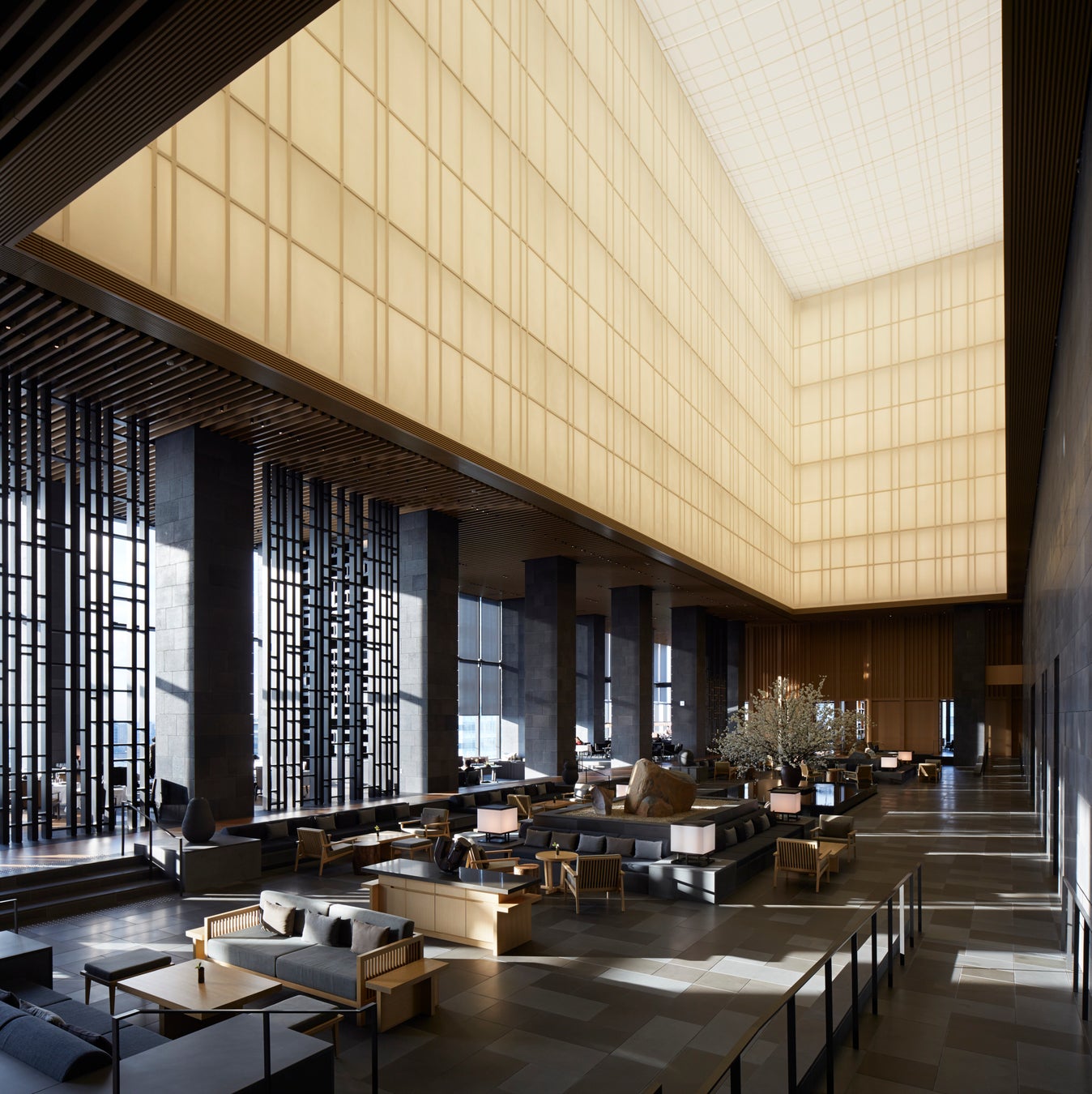 伝統的な日本の意匠に現代性を融合させ、日本の伝統家屋をコンセプトにデザインされたアマン東京には、その土地の環境を大切にし、伝統文化の継承を尊ぶアマンならではの静謐な空間が広がります。木、和紙、石などの温かみのあるマテリアルを用いることで、日本ならではの豊かな質感を表し、光と陰影が織りなす美しくダイナミックな空間からは、刻一刻と変化する空の色をお楽しみいただけます。凛とした中にも温もりのある、日本庭園をイメージしたロビーフロアのガーデンラウンジには、縁側に見立てた通路や、中心に配置された生け込みに、縁側から庭を眺めて季節の移ろいを感じて過ごしてきた日本人のライフスタイルを表現し、自然に寄り添うアマンの姿勢を映し出しています。また、禅の要素を取り入れ整然と敷き詰められた石庭は、訪れる人に、日常の雑念や煩わしさからの解放と、心の平穏をもたらしてまいりました。