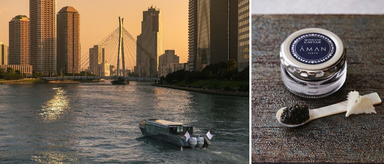 穏やかに流れる隅田川クルージングでは、冬の澄んだ空気の中、夕暮れ時の幻想的なマジックアワーに少しずつライトアップされていく東京の街並みを、普段とは違うアングルからご覧いただけます。船上にて、シャンパーニュとともに、香川県産のアマン東京オリジナルキャビアでアペリティフの時間をお過ごしください。