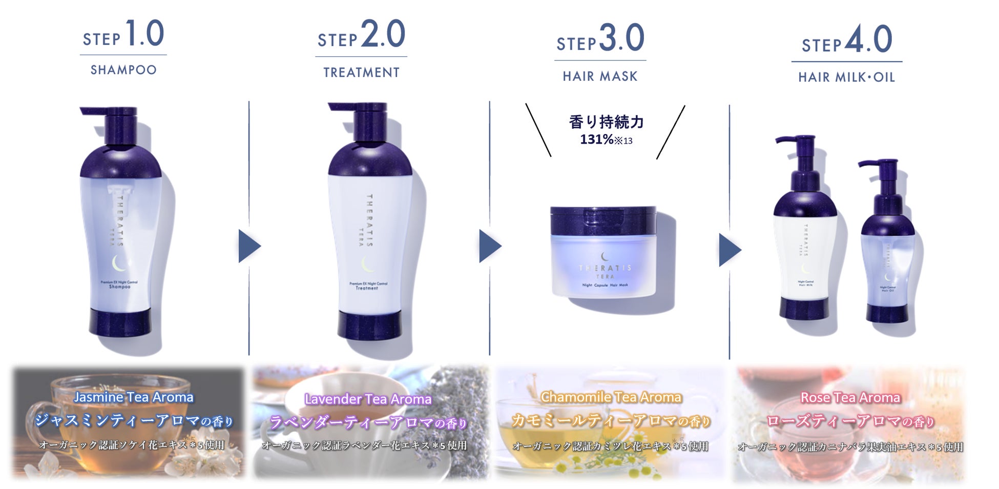 2021年9月に「寝ぐせ・ダメージケア」に特化した『セラティス ナイトリペア』、2023年10月に「地肌・うねりケア」に特化した『セラティス ムーンライト スリーク』、2024年9月に枝毛やパサつきなど毛髪全般の悩みにアプローチするプレミアムライン『セラティス テラ プレミアム EX ナイト モイスト』を発売いたしました。そして2025年7月に全方位うねりケアを提案する『セラティス テラ プレミアム EX ナイト コントロール』を発売いたします。
