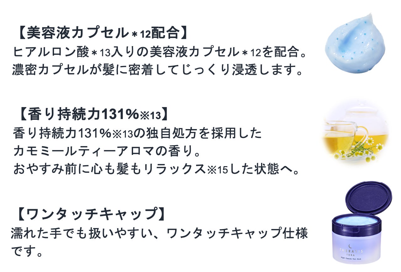 *17 加水分解ケラチン(羊毛)、セラミドNG、加水分解乳タンパク(全て補修)(THERATIS Night Repairシリーズに配合)、加水分解コラーゲン(保湿)(THERATIS TERA Premium EX Night Moistシリーズに配合)、加水分解水添デンプン(保湿)(THERATIS TERA Premium EX Night Controlシリーズに配合)、セラミドNP、セラミドAP(全て補修)(THERATIS Night Repairシリーズ、THERATIS TERA Premium EX Night Control シリーズに配合)