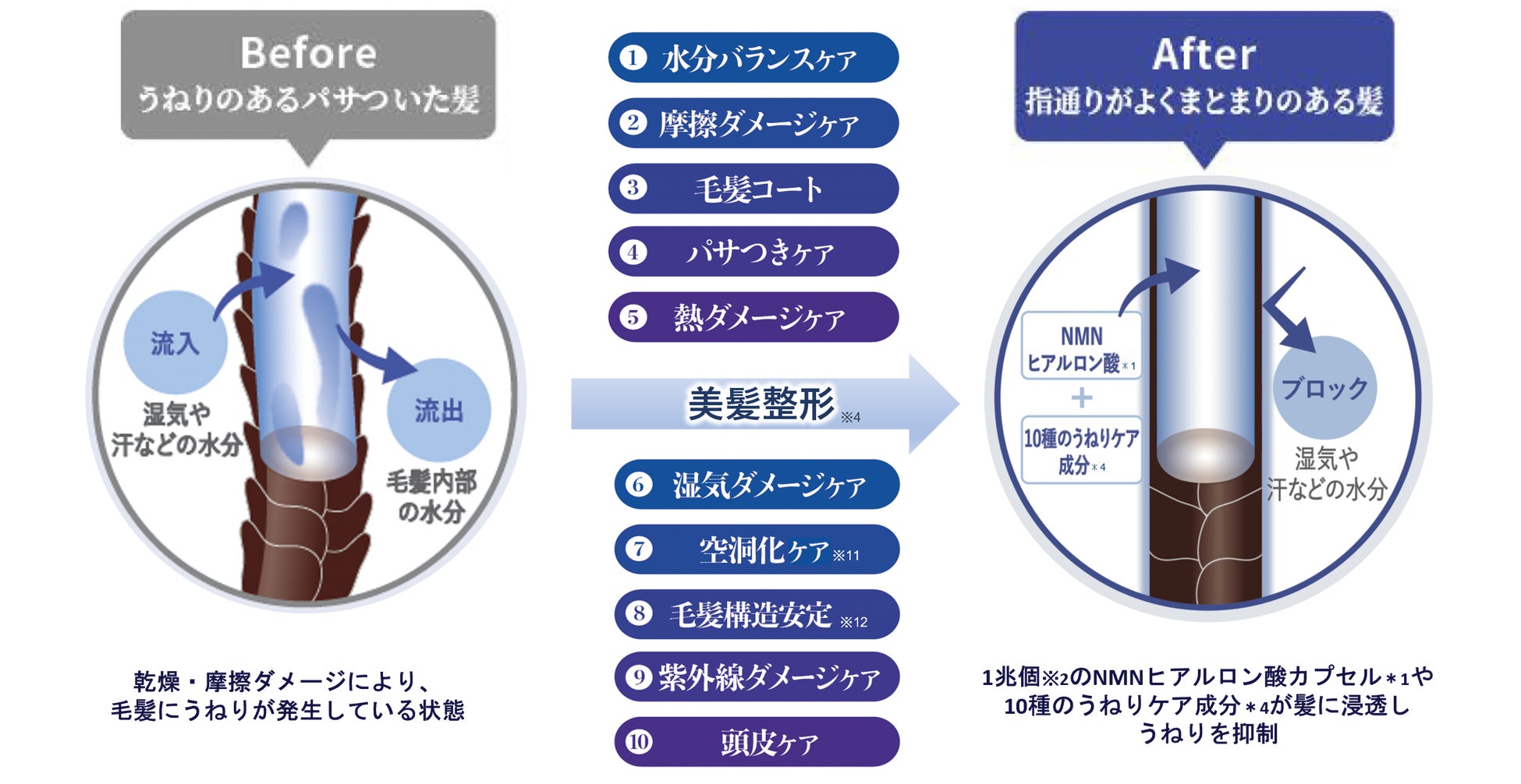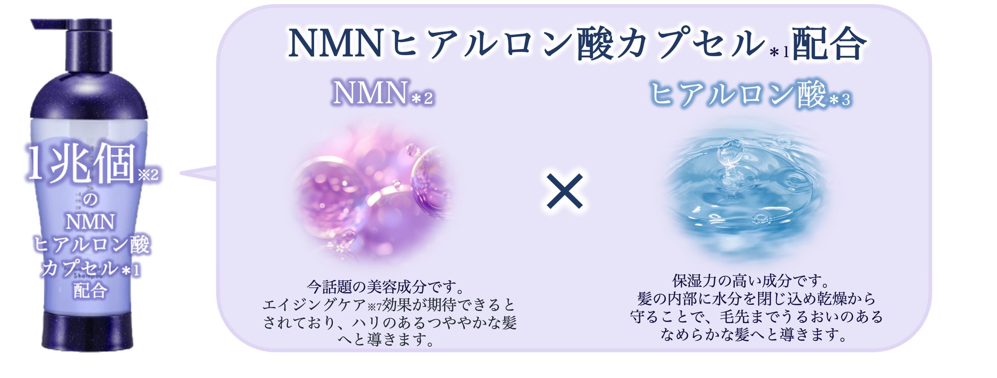 エイジングケア※7で高い注目を集めているNMN*2と髪にうるおいを与えるヒアルロン酸*3をリポソーム化して1兆個※2配合。ハリコシを与えながら水分バランスを整え、うねりをケアします。