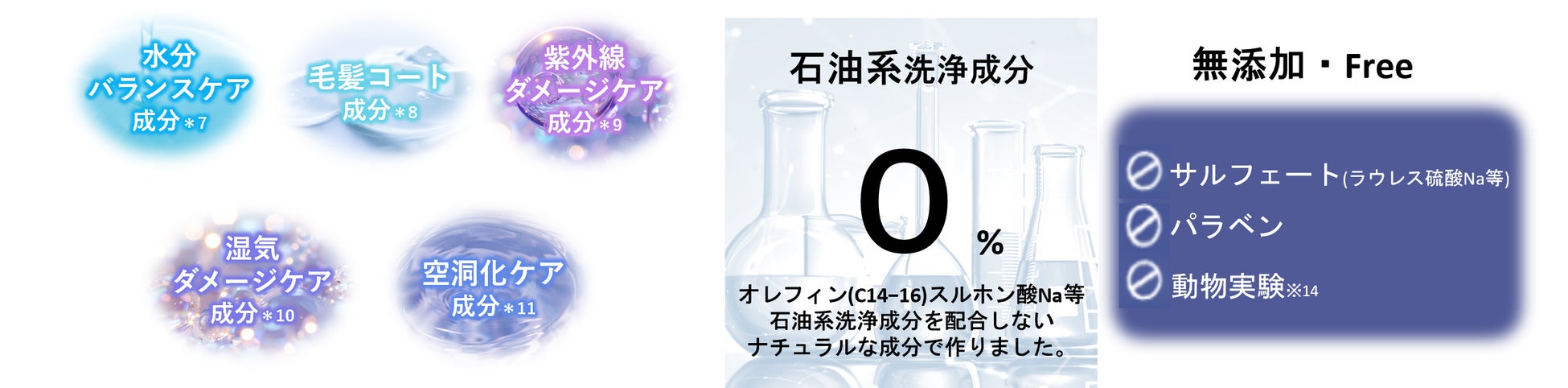 石油系の洗浄成分を使用せず、厳選したヒアルロン酸複合洗浄成分*6を配合し、保湿しながら髪を洗い上げます。
