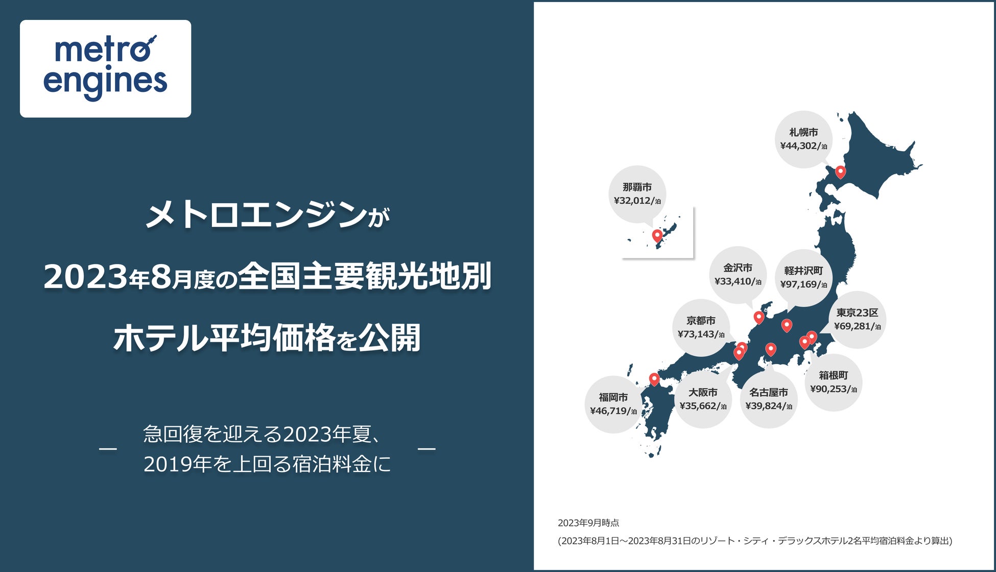 ビッグデータを活用し宿泊業界のDX化を支援するメトロエンジンが全国主要観光地の2023年8月度ホテル平均価格を公開