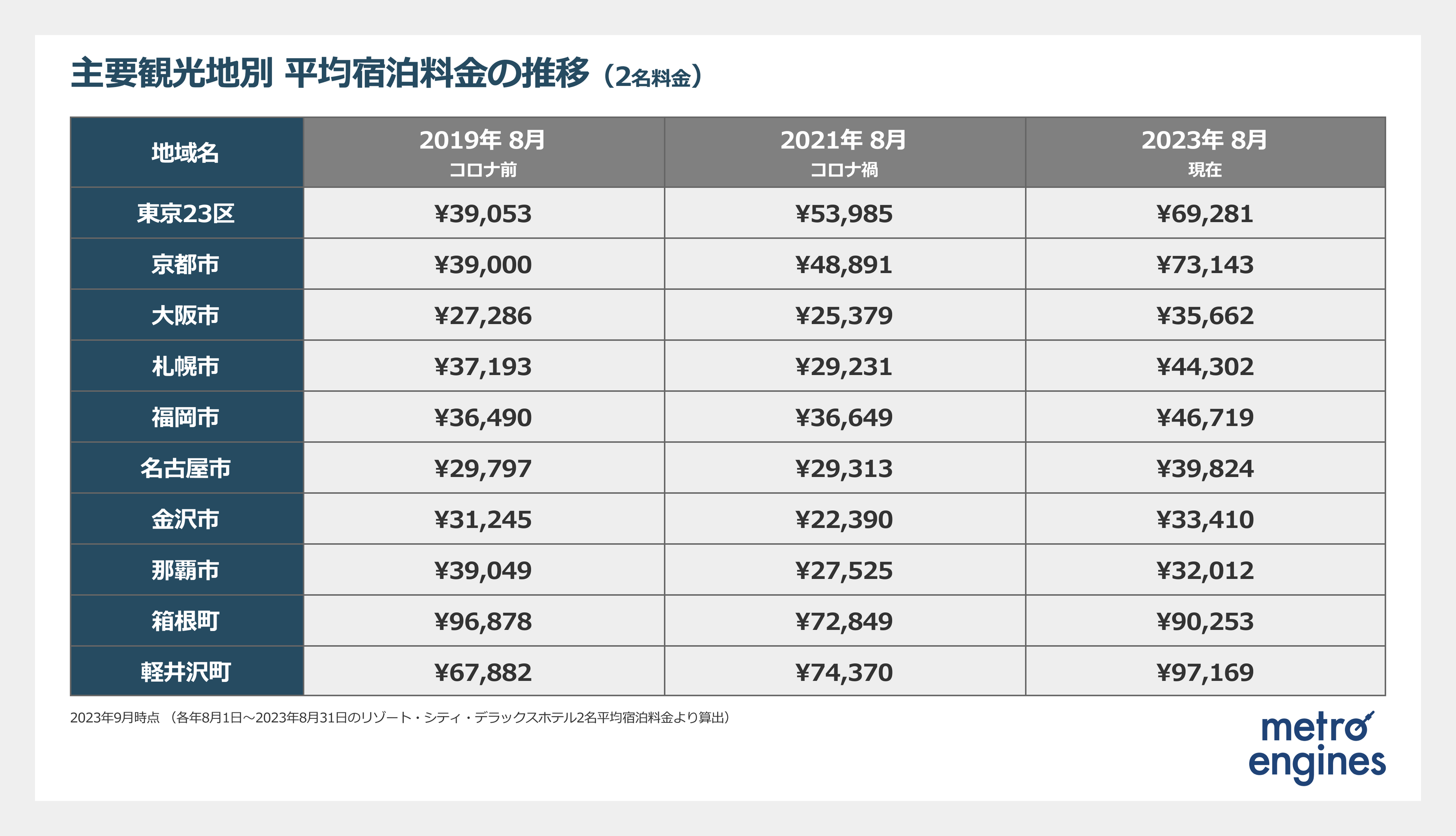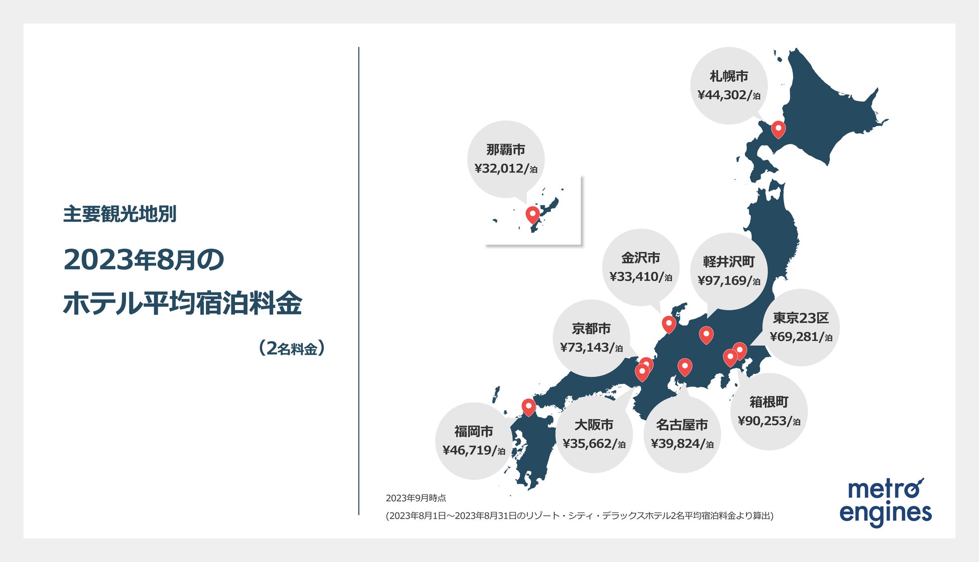 そこでメトロエンジンは、今夏における宿泊・観光動向を図る一つの指標として、2023年8月のホテルの平均価格を観光地に特化して集計し、夏シーズンの最新宿泊価格を発表いたします。