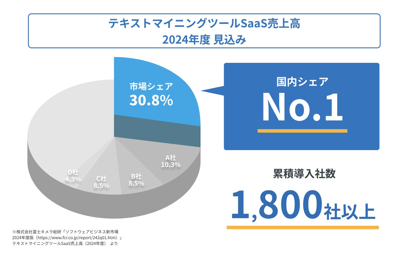 この度、見える化エンジンは株式会社富士キメラ総研が発行する「ソフトウェアビジネス新市場2024年版」において「テキストマイニングツールSaaS売上高」でのシェア率が全体の30.8%となり、13年連続国内シェアNo.1を獲得しました。