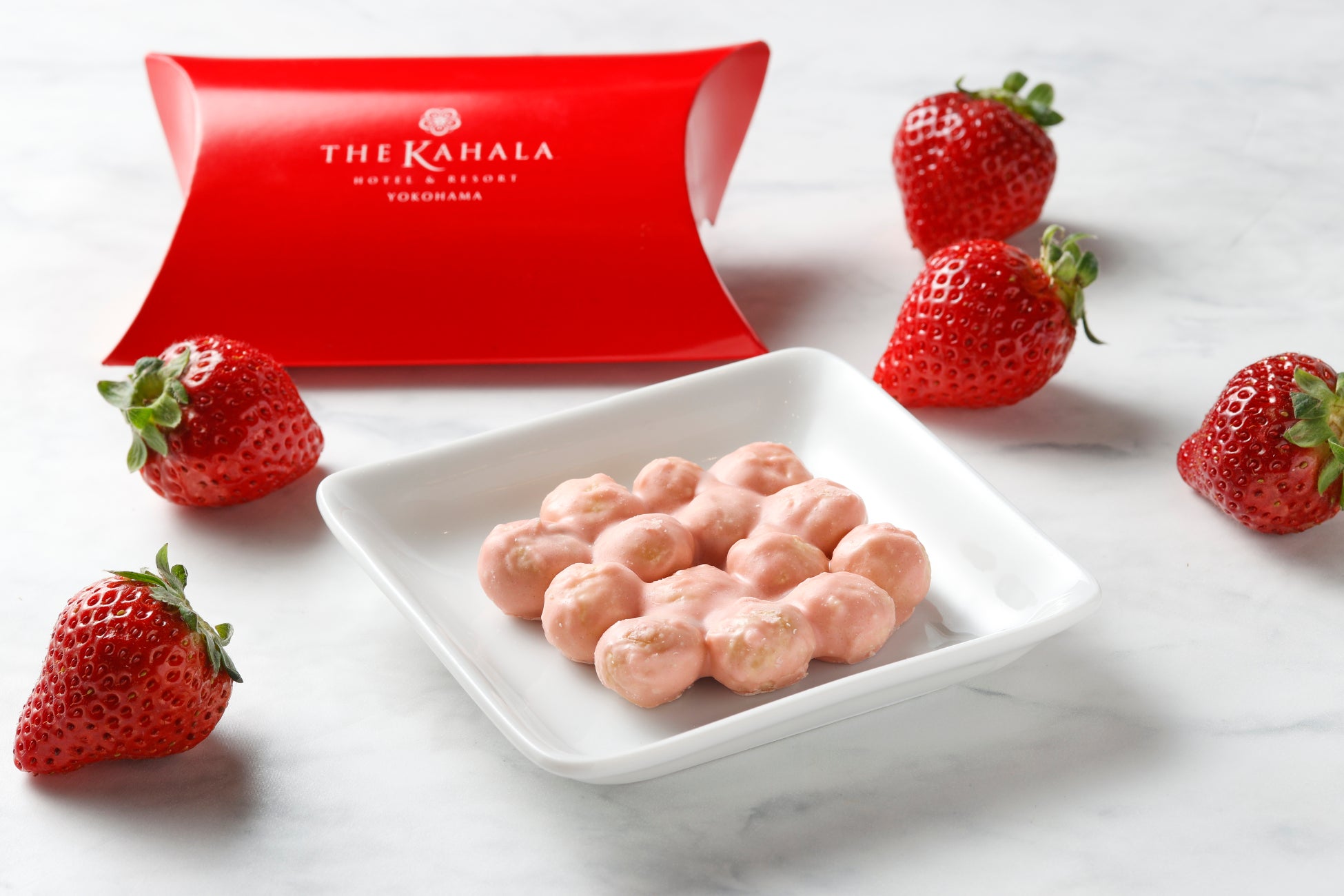 THE KAHALA HOTEL & RESORTを代表する「マカダミアナッツチョコレート」。フランス「ヴァローナ社」のチョコレートとオーストラリア産マカダミアナッツを使用したホテルのシグネチャー商品です。期間限定の「ストロベリーフレーバー」はマカダミアナッツの甘みとストロベリーの甘酸っぱさが楽しめます。