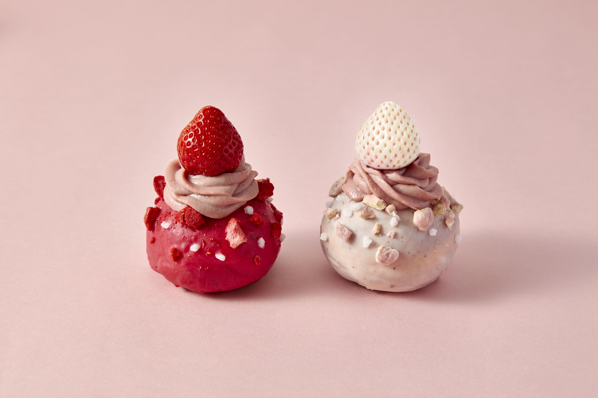 カスタードとストロベリーソースを詰め込み、ストロベリーガナッシュで仕上げた2種のドーナツ。見た目も可愛く、あまおうと淡雪でそれぞれ彩りました。