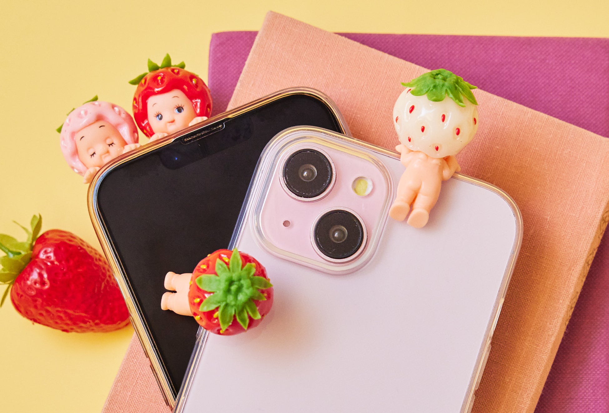 ちょこんと顔を出す姿が可愛らしい、ぶら下がり苺キューピーちゃん。スマホなど好きなところに貼って、日常のささやかな癒しに。
