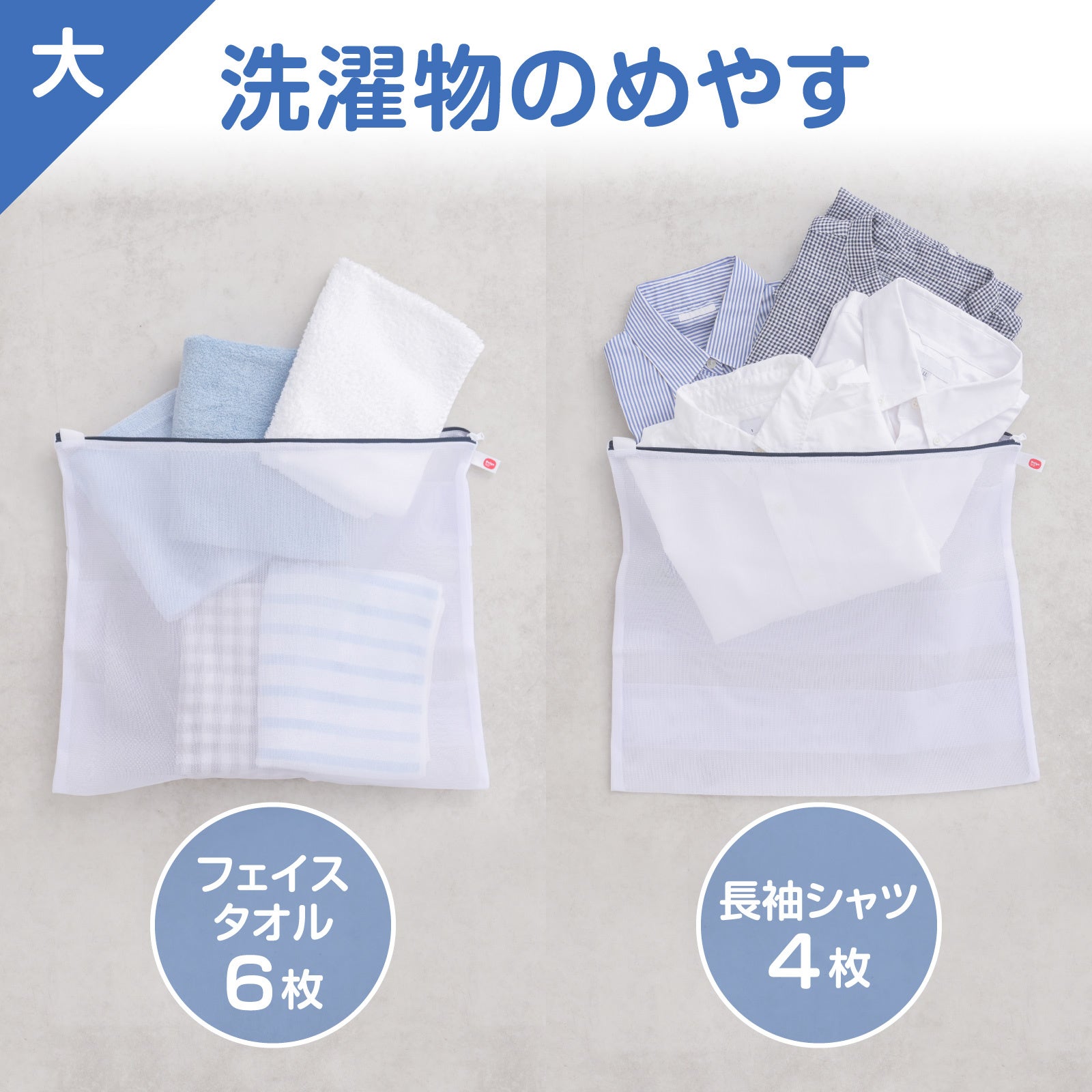 大サイズはフェイスタオルなら6枚、長袖シャツなら4枚、小サイズは厚手の靴下なら2足、ストッキングなら4足洗えます。
