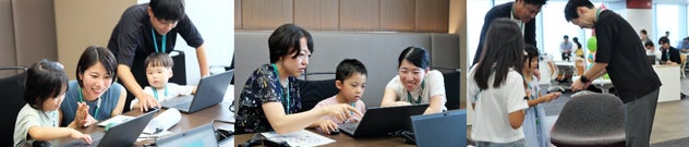 「こども参観日」の当日は、21名の子どもを含む14家族38名の参加となりました。子供たちには1日社員証と名刺が配られ、ビジネスの基本となる名刺交換体験をはじめ、稟議書の作成、社長室での記念撮影など、オフィス全体を使って社員と交流しました。また、当社のAIエンジニアが目玉企画として準備した音声変換アプリ体験や、スクラッチ開発によるプログラミング体験では、多くの子どもたちが目を輝かせて取り組みました。