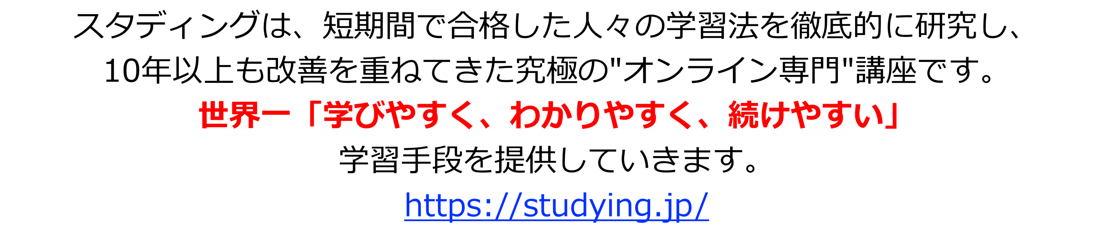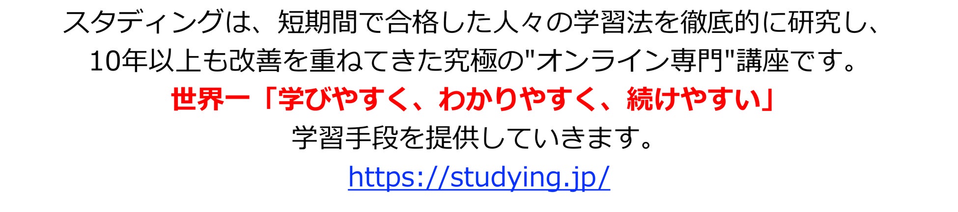「スタディング」(https://studying.jp/)は、短期間で合格した人々の学習法を徹底的に研究し、10年以上も改善を重ねてきた究極のオンライン資格取得講座です。