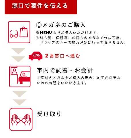 店舗横のドライブスルーレーンを進んだ先にある「メニュー」からメガネを選び、車内で試着。メガネを選んだら、その場で会計が可能。度なしパッケージタイプのメガネであればすぐに受け取りができます。
