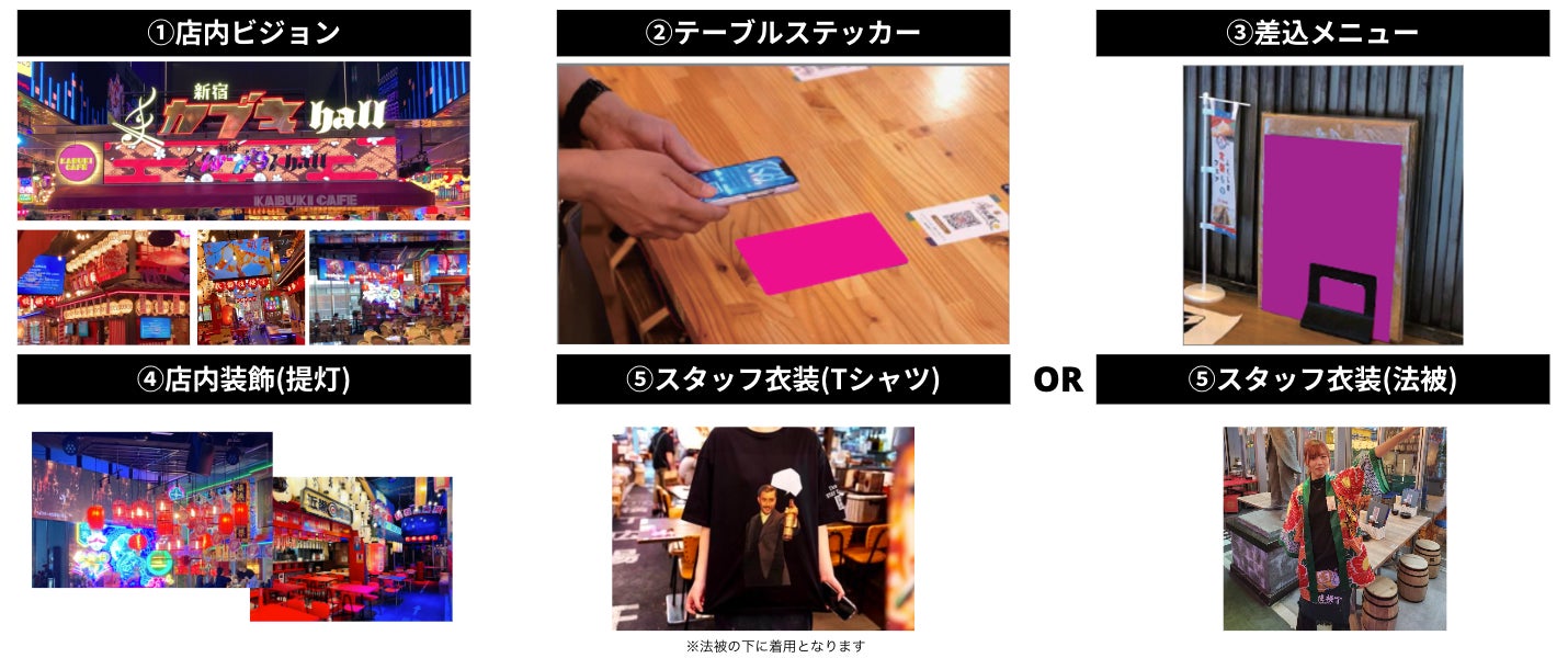 店内ビジョン放映のみのプランから、テーブルステッカー・差込メニュー・店内装飾(提灯)・スタッフ衣装など「新宿カブキhall~歌舞伎横丁」をフルジャックできるプランまで幅広く対応可能です。
