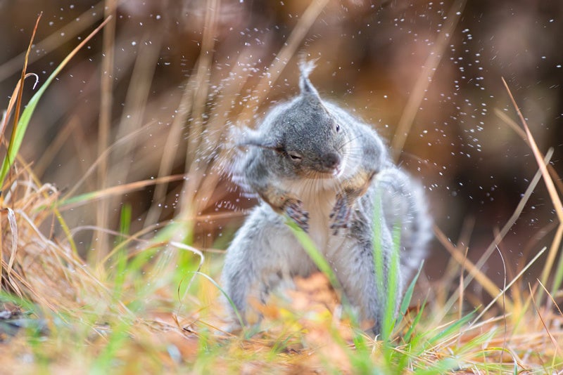 ニホンリスは、とてもかわいらしい生きものですが、一方で動きが素早いこともあって、なかなかその表情を捉えきれません。デジタルカメラの性能が向上したことで、今まで人間が気づかなかったその生きる瞬間をキャッチできるようになりました。雨の中、元気に走り回った後で、ぶるっとからだを震わせて水滴を払うその生きる姿はほんとうに魅力的です。まさに、一期一会。そして、どんなに撮影機器が良くなっても、それを活かすのはあくまでも人間。人工知能とのアラインメント(共存)が問題になる今、デジタルカメラと人間の素敵な共進化の最前線がここにあります。リスが地球の生物多様性の仲間であることを実感させてくれる、素晴らしい一枚です。