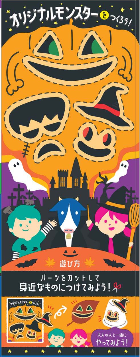 パッケージ側面に掲載されたオリジナルモンスターのパーツ(目や口など)を切り取り、様々なものに貼って楽しむことができるよう工夫したデザインを採用。秋ならではの楽しい時間を演出します。