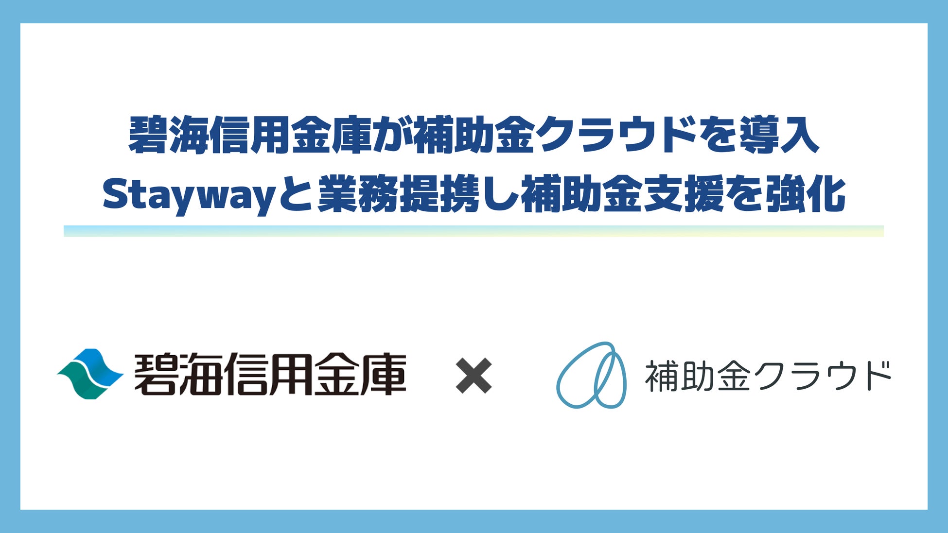 補助金支援のDXを通じた経営支援サービス「補助金クラウド」「前ほじょくん(補助金債権の早期資金化)」を運営する株式会社Stayway(本社:大阪府大阪市、代表取締役: 佐藤 淳、以下「Stayway」)は、碧海信用金庫(本店:愛知県安城市、理事長:深谷 誠、以下「碧海信金」)と業務提携を開始したことをお知らせします。本業務提携を通じて、碧海信金の補助金・助成金に関する情報提供、相談対応、補助金申請支援までを補助金クラウドが一気通貫で支援することで、同庫がお客さまへ公平に成長機会を与えられるよう、庫内の補助金活用支援の体制強化を図ってまいります。