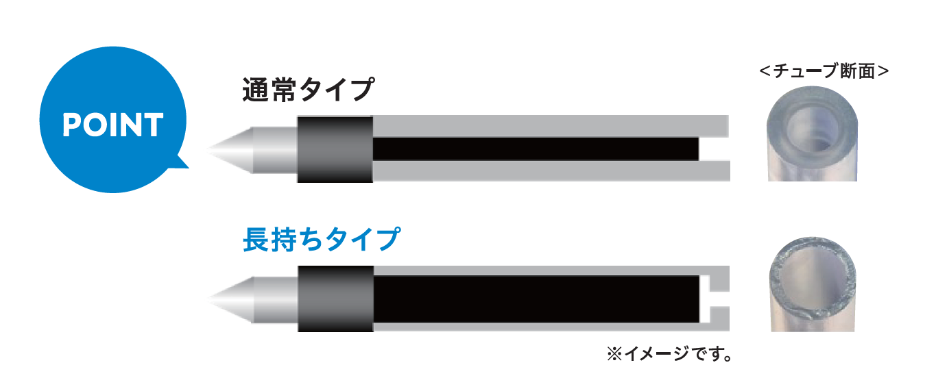 最もよく使う黒インクには、リフィルのチューブを薄くすることで、当社通常品(SXR-80)と同じ形状で互換性を保ったまま通常品に比べインク量を約70%増量した「長持ちリフィル」を搭載しています。また、チューブが薄くなることで、プラスチック使用量も通常品に比べ約30%減量しております。